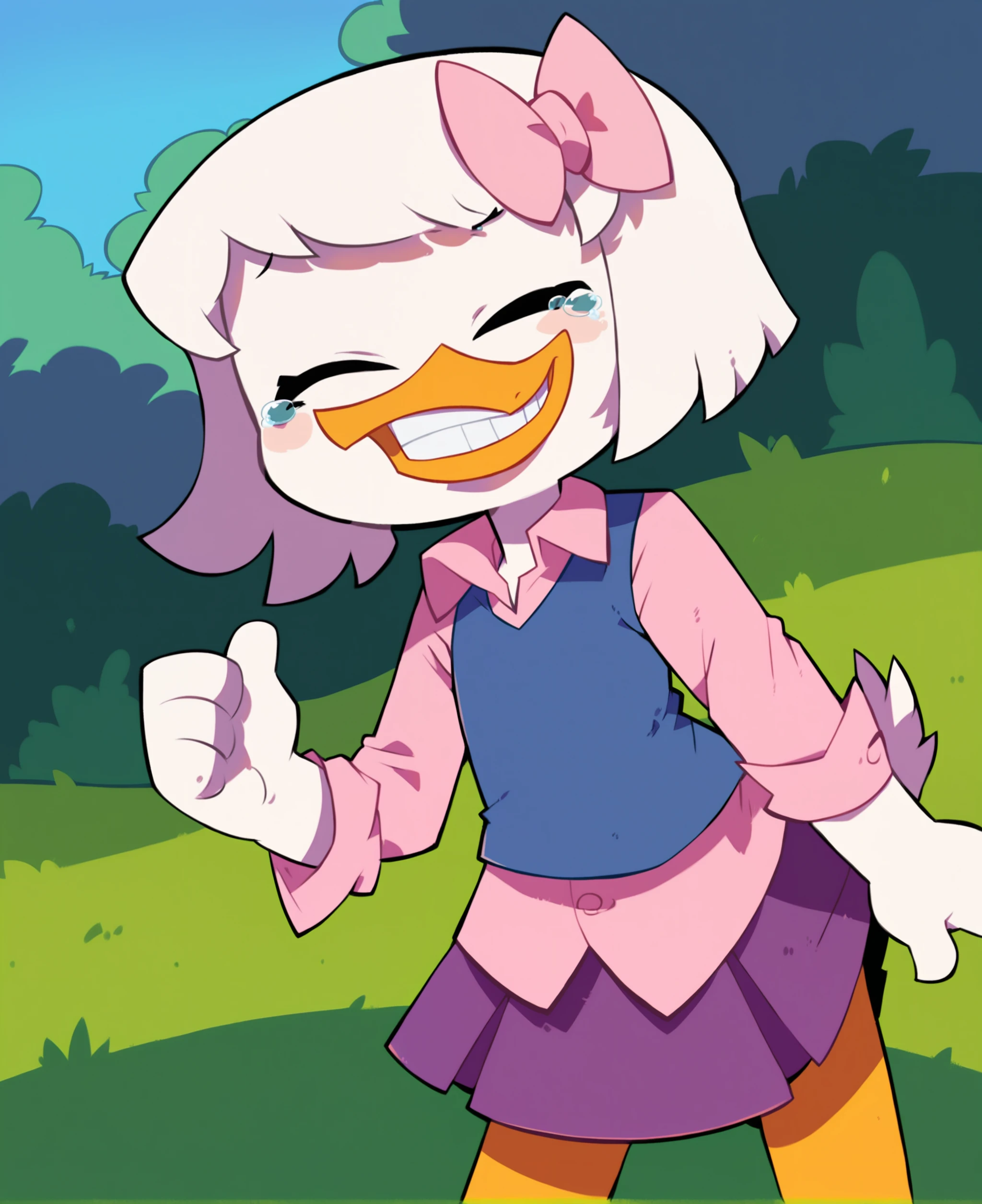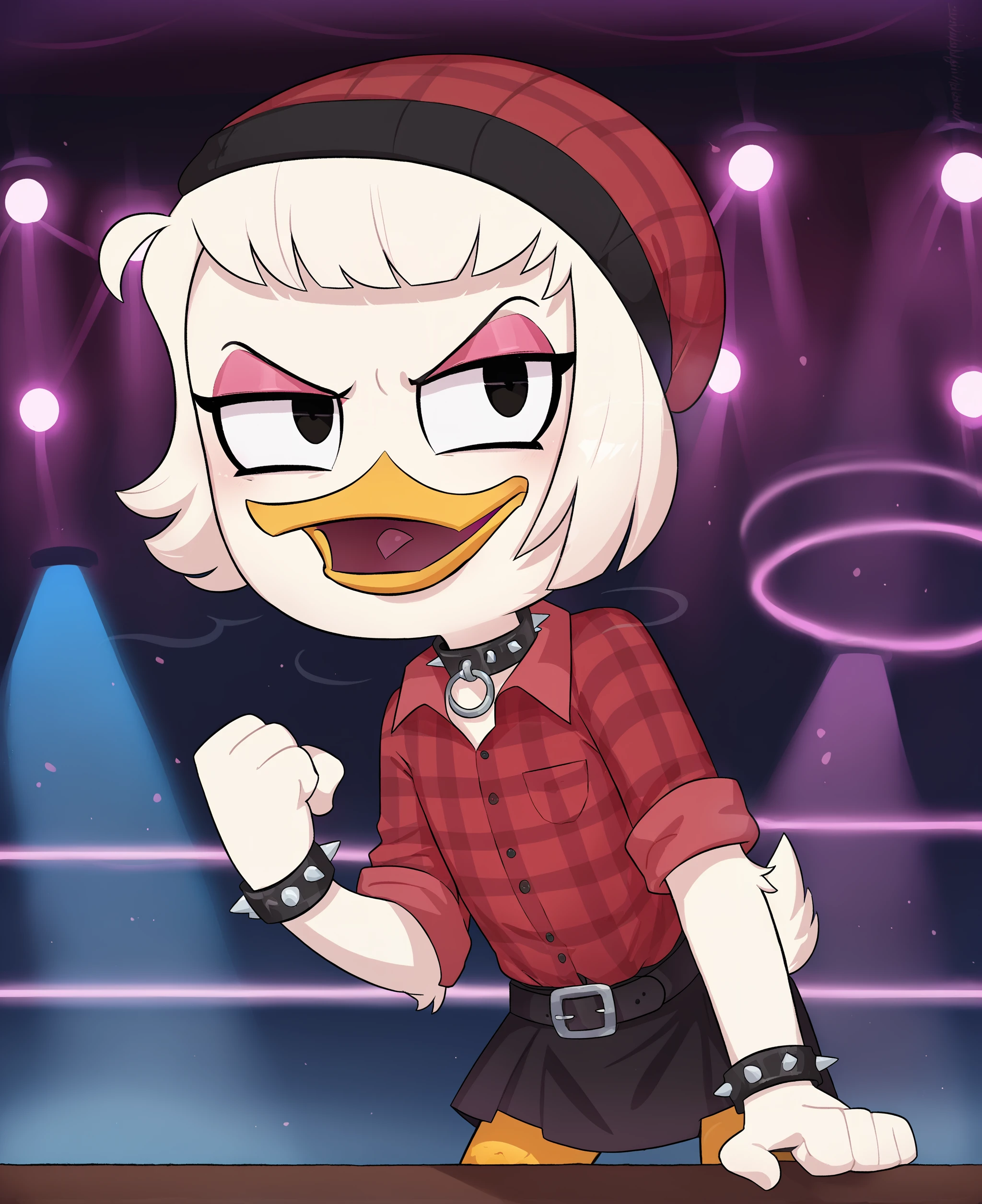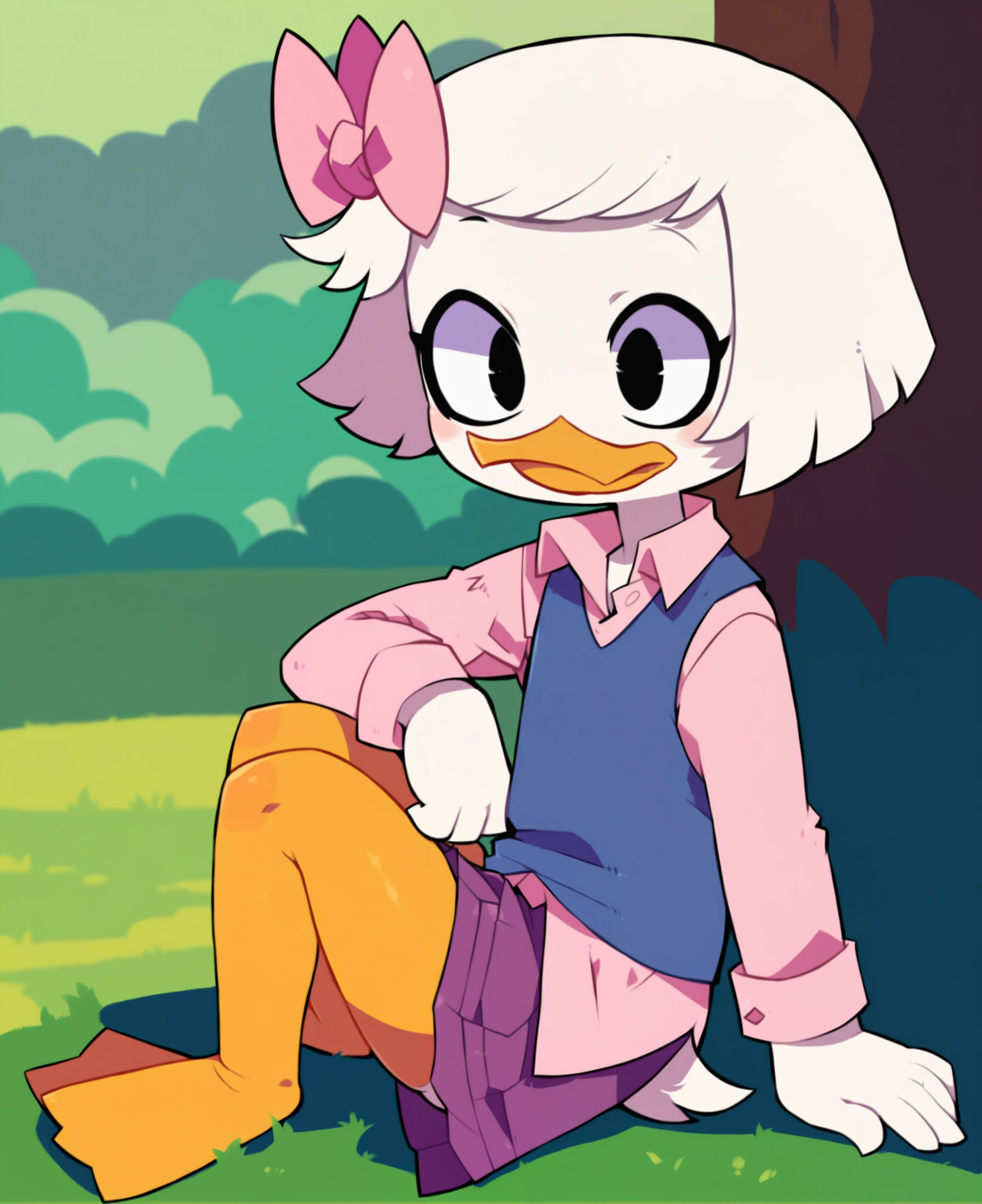 webby vanderquack, ducktales, duck, beak, scut tail, white skin, white hair, short hair, eyeliner, orange legs, webbed feet, black eyes,