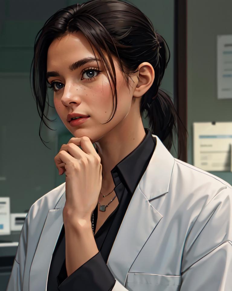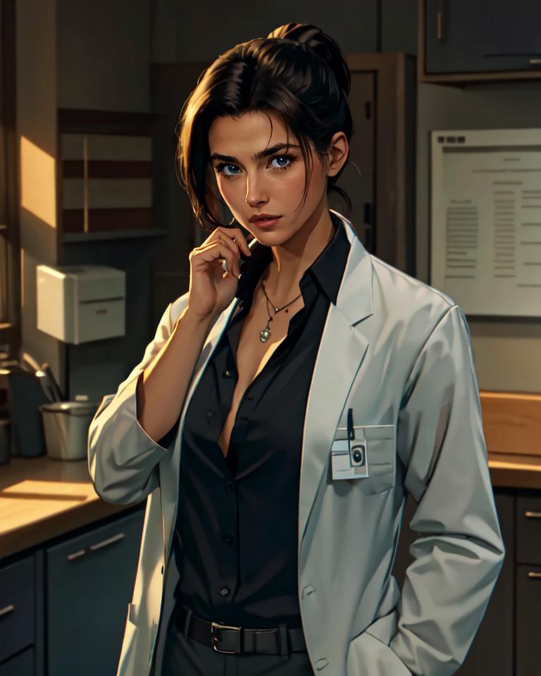 naomihunter, 1girl, black_hair, ponytail, lab_coat, collared_shirt, black_shirt, unbuttoned, id_card, necklace, open_clothes