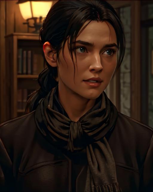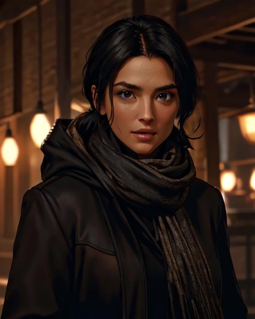 naomihunter, 1girl, black_hair, ponytail, black_coat, black_scarf