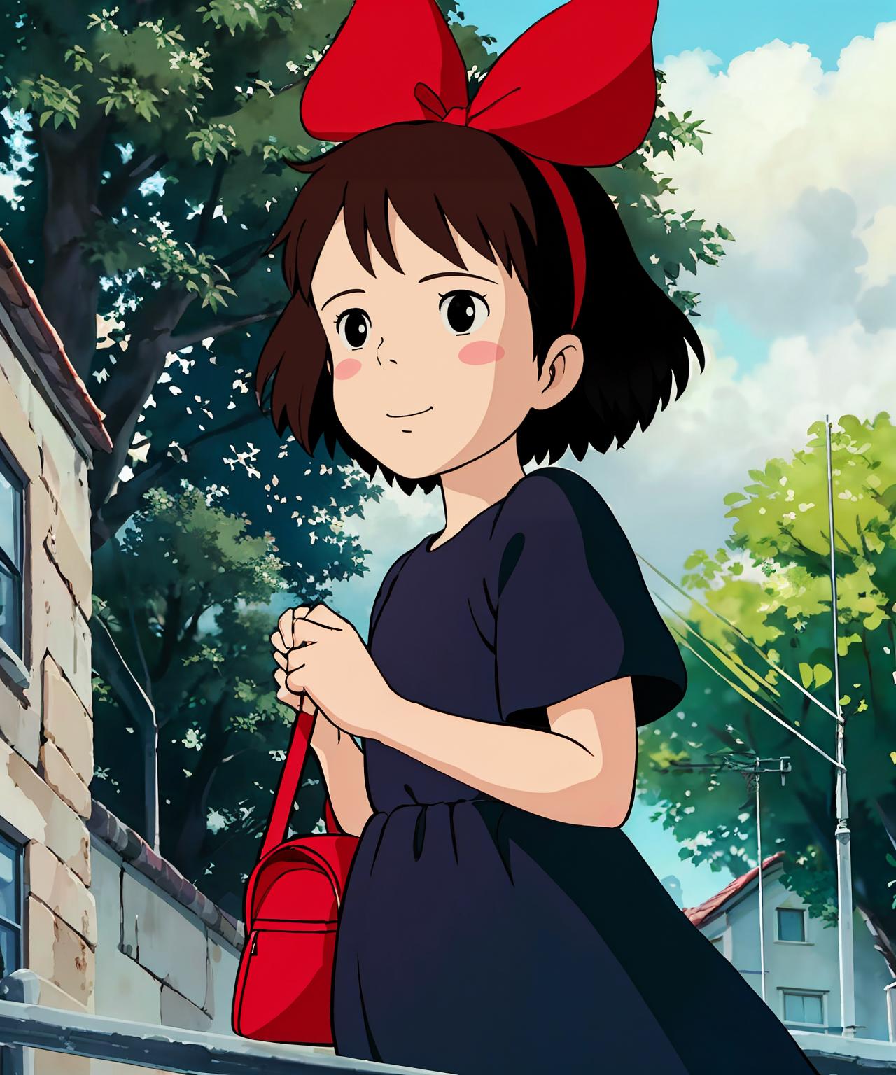 Prompt: 1girl, solo, blush, smile, short hair, brown hair, dress, bow, hair bow, hairband, outdoors, bag, black eyes, red bow, tree, blush stickers, railing, kiki \(majo no takkyuubin\), <lora:ghibli_anime_v1:0.6>