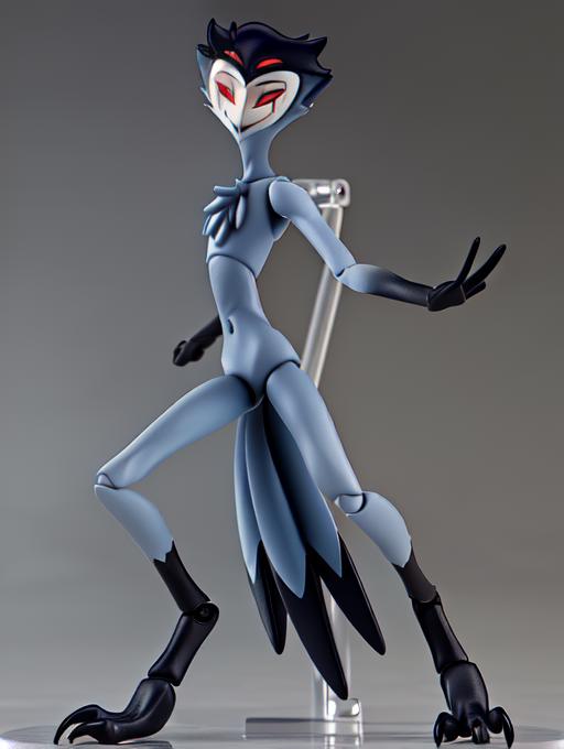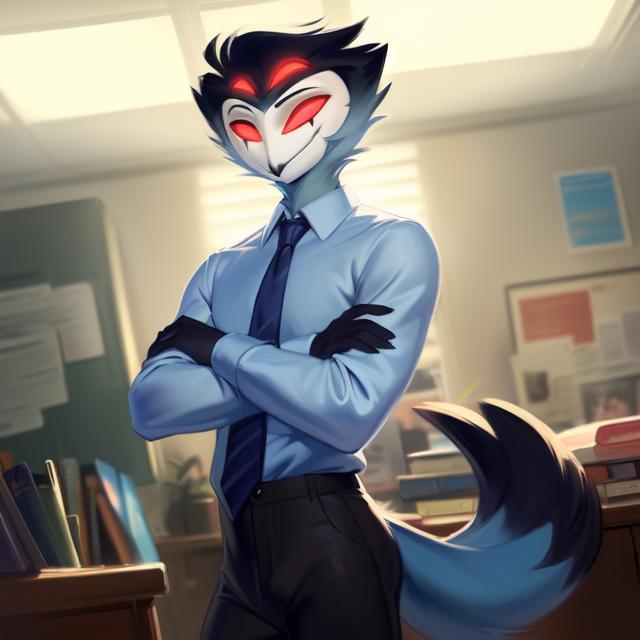 General: stolas \(helluva boss\), ????? tuft, grey fur, short hair, black hair, white face, girly, skinny, black legs, black hands, tail, red eyes, four eyes, extra eyes