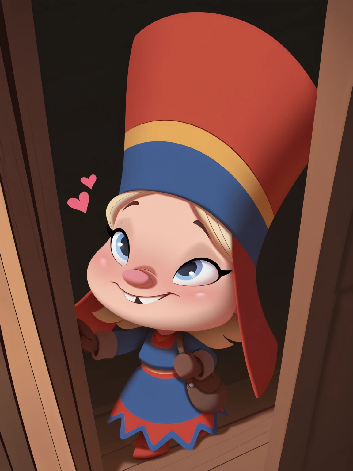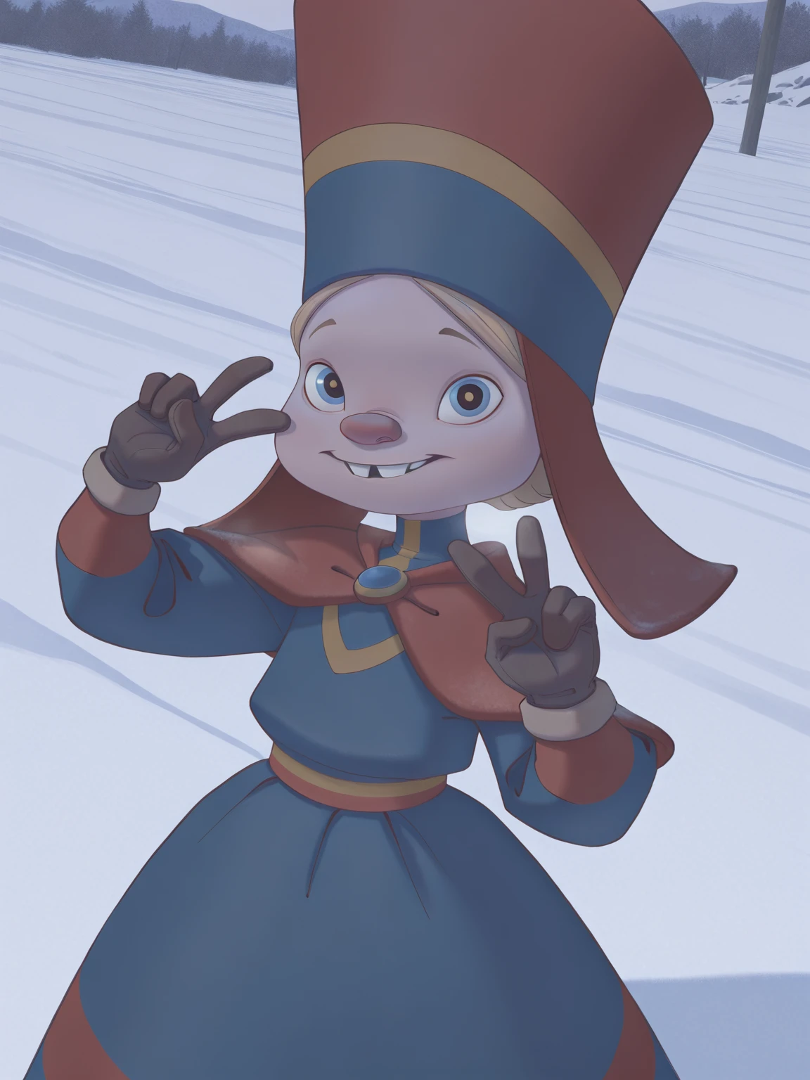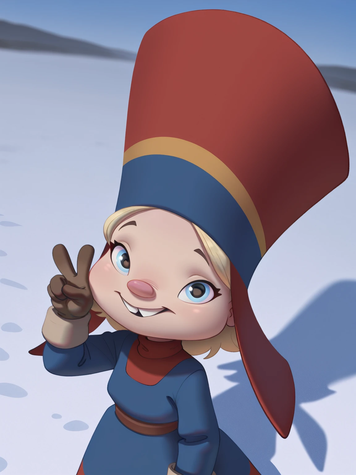 margu or margu_timeskip, buck teeth, red-blue headwear, blue-red dress