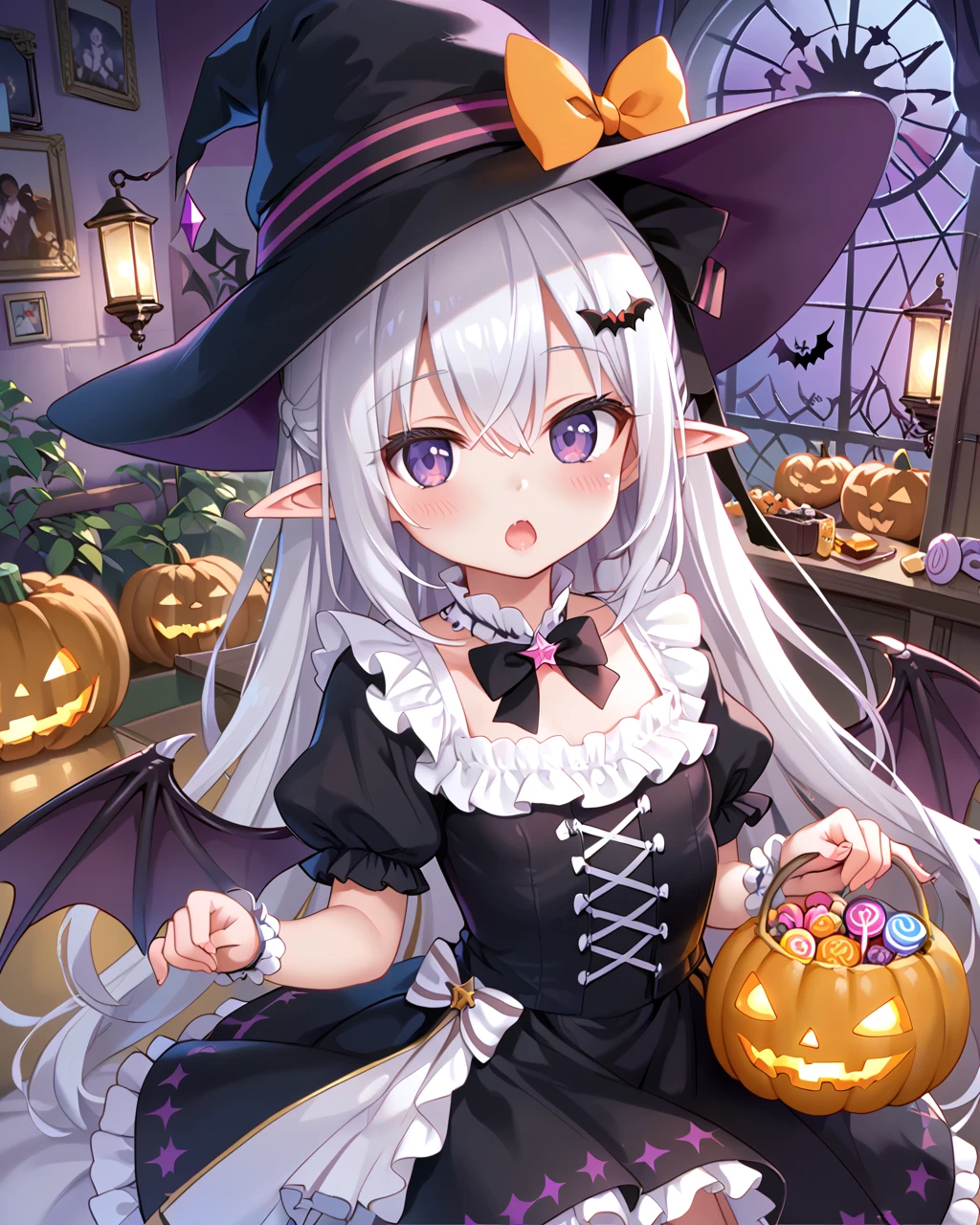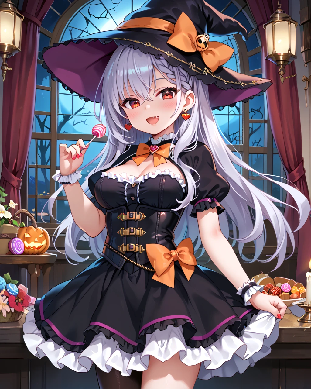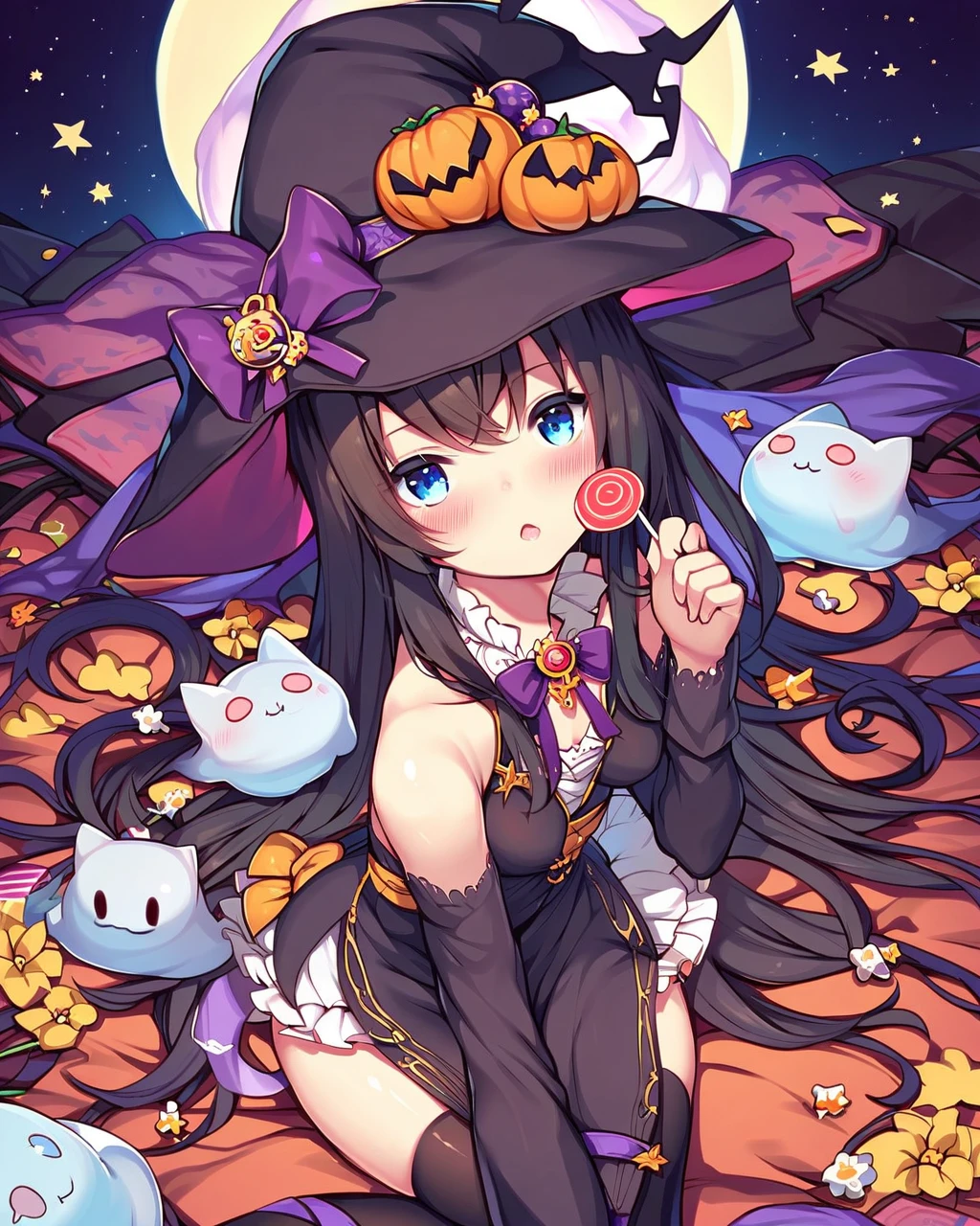 Trained tags: halloween, jack-o'-lantern, jack-o'-lantern bucket with candy, swirl lollipop, ghost, halloween striped thighhighs, string of flags, witch hat