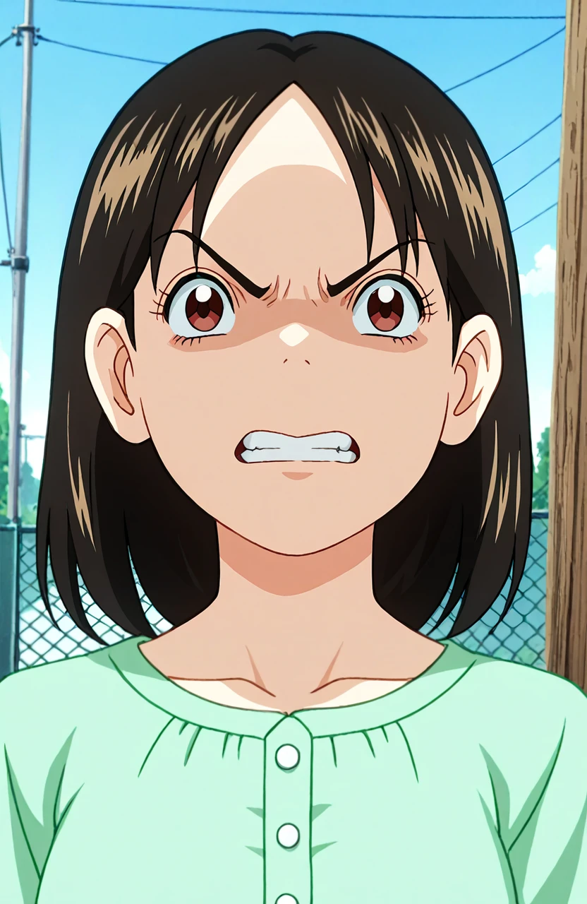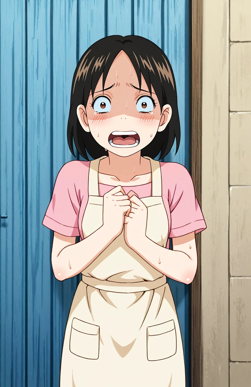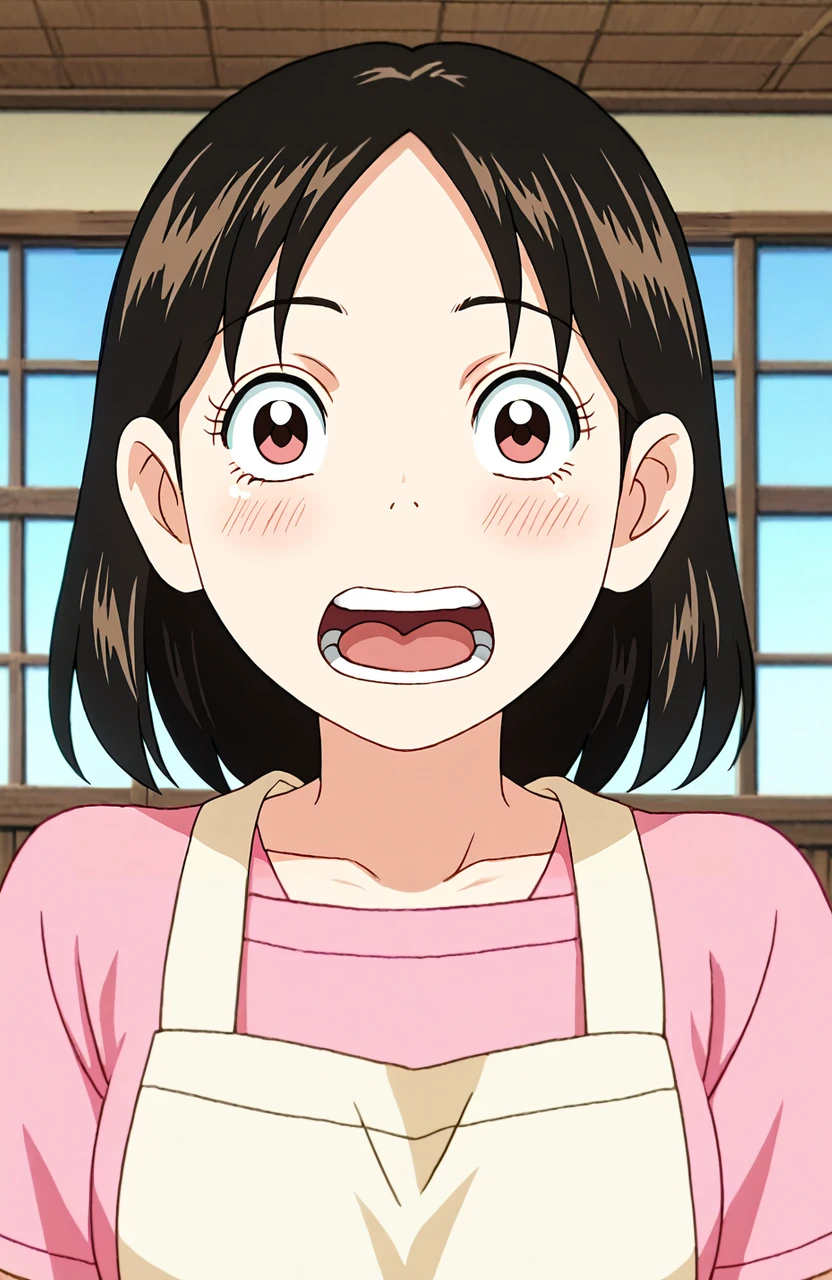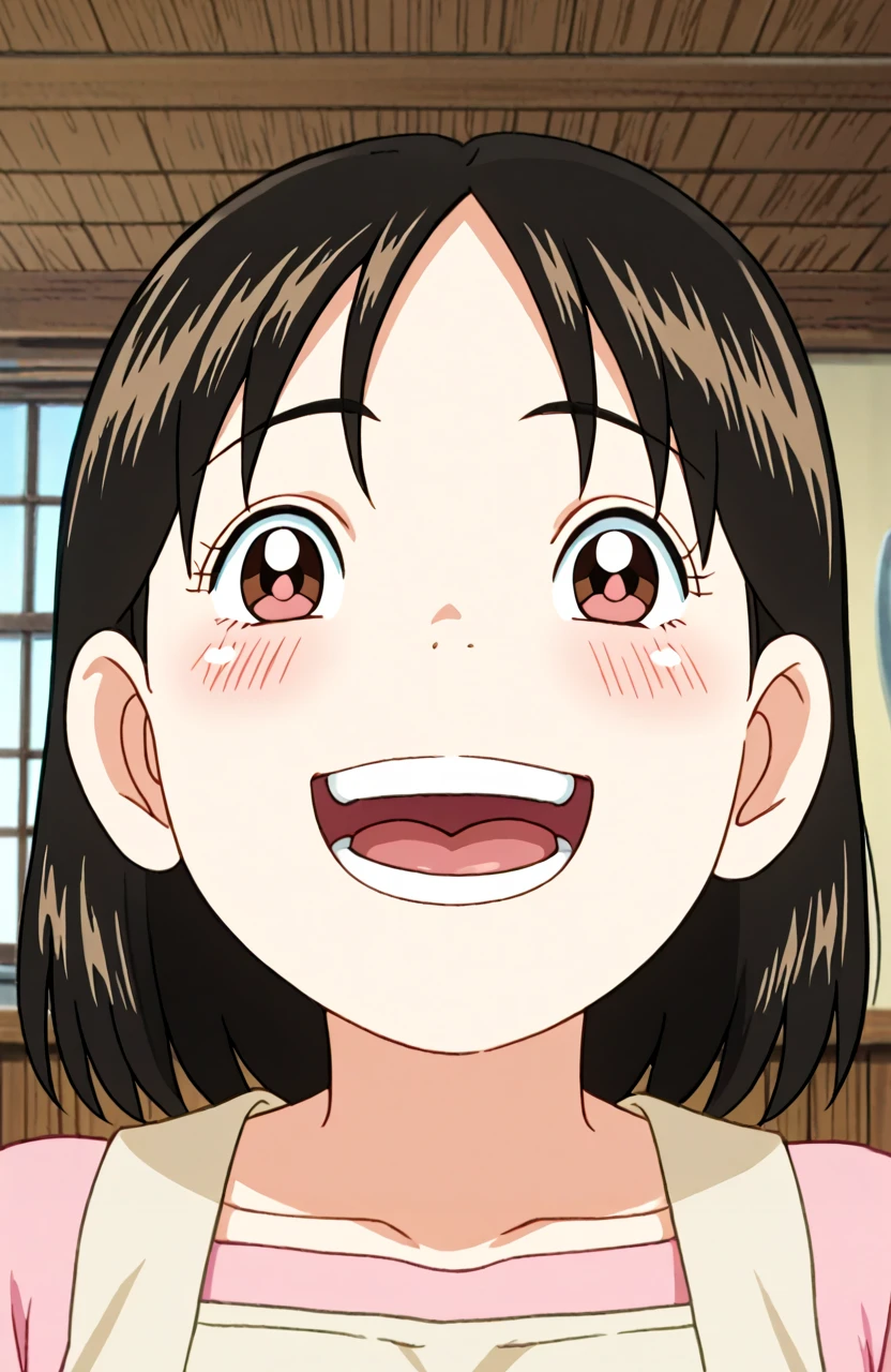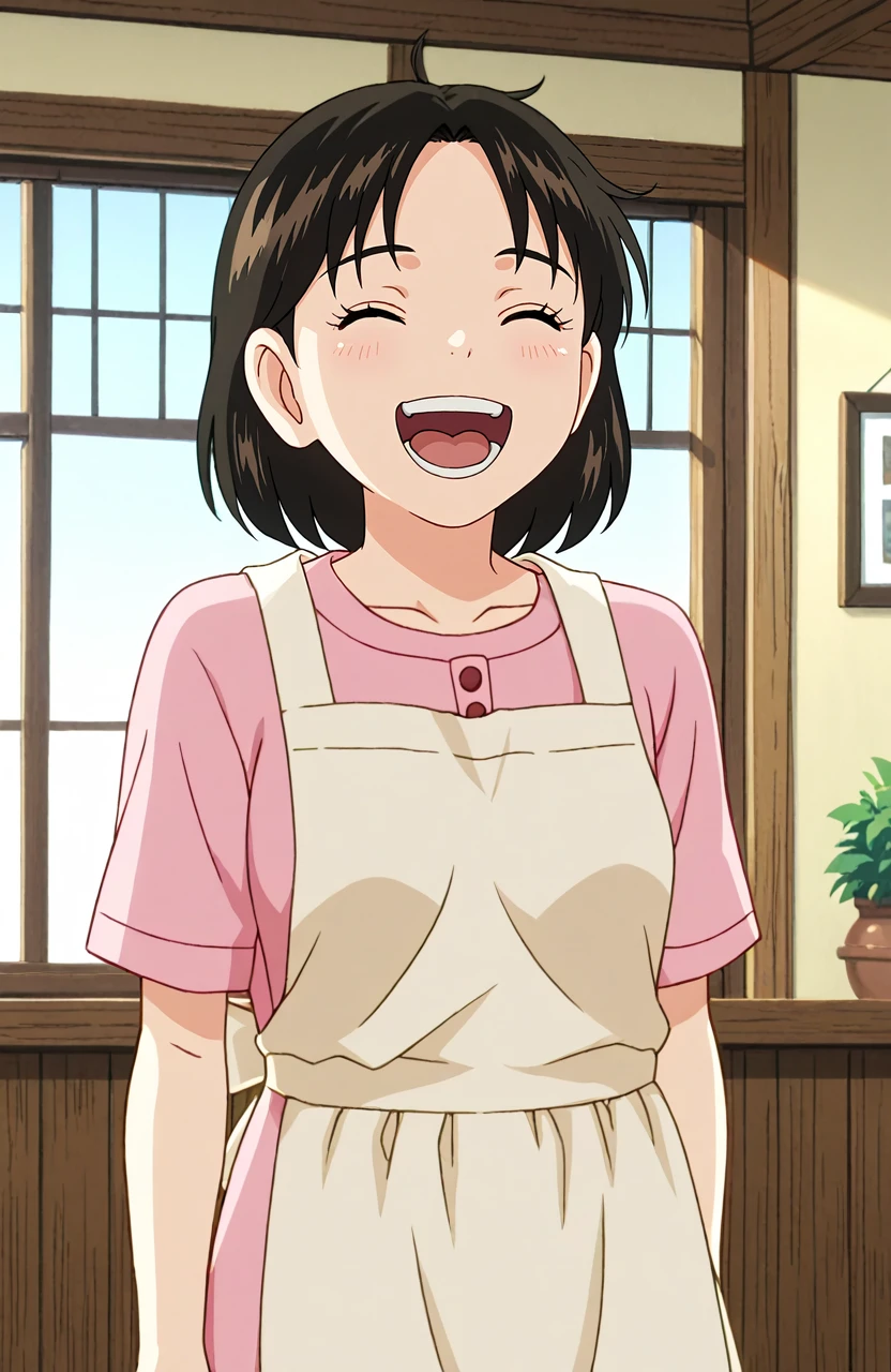 Prompt: 1girl, Junko Oosawagi, blush, smile, ??????????????, short hair, apron, shirt,