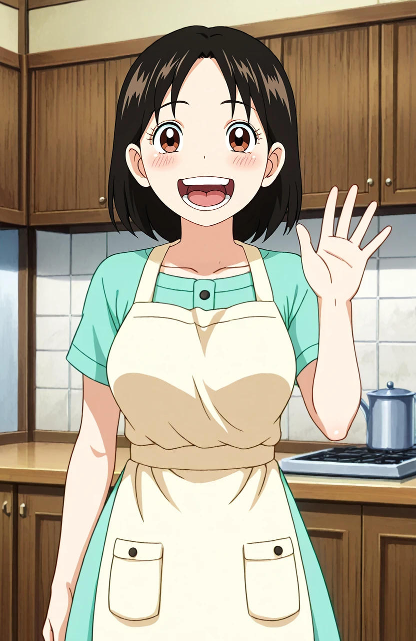 1girl, Junko Oosawagi, blush, smile, medium breasts, short hair, apron, shirt,
