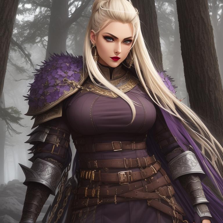 Brigandine Armor, Dame, Short, Fit, Triangular Face, Tan Skin, Silver Hair, grey-blue Eyes, Narrow Nose, Thick Lips, Sharp Chin, Long Hair, Thick Hair, Herringbone Braid, firm ???????, Dangle earrings, orange, cream lipstick, An ancient forest shrouded in mist, where the branches of the trees intertwine like the ribs of a cathedral in the sky