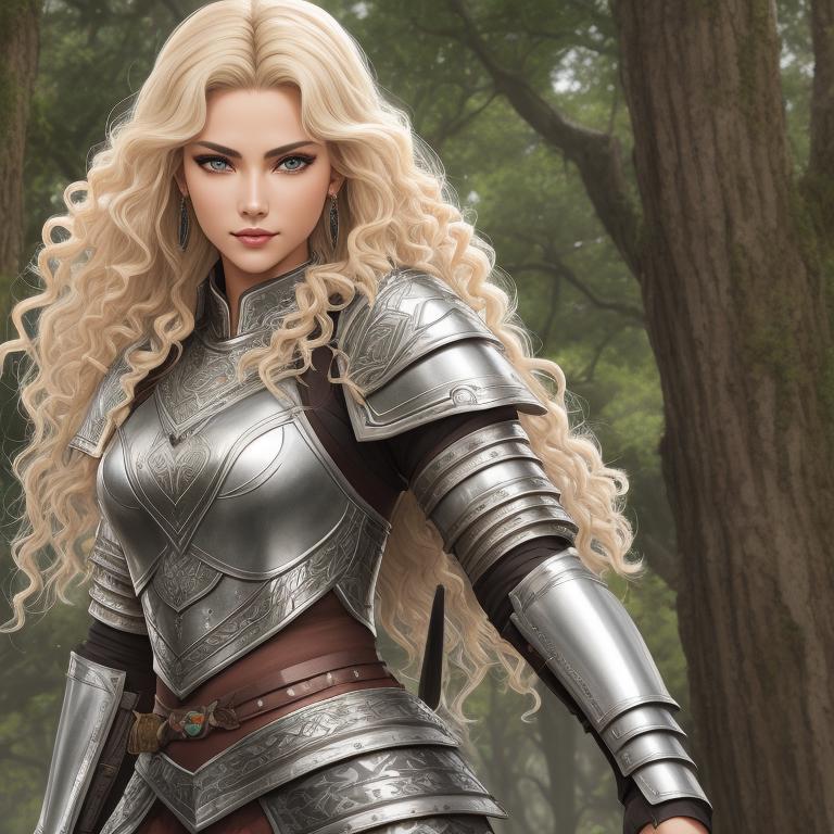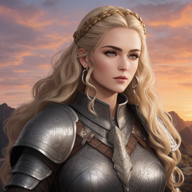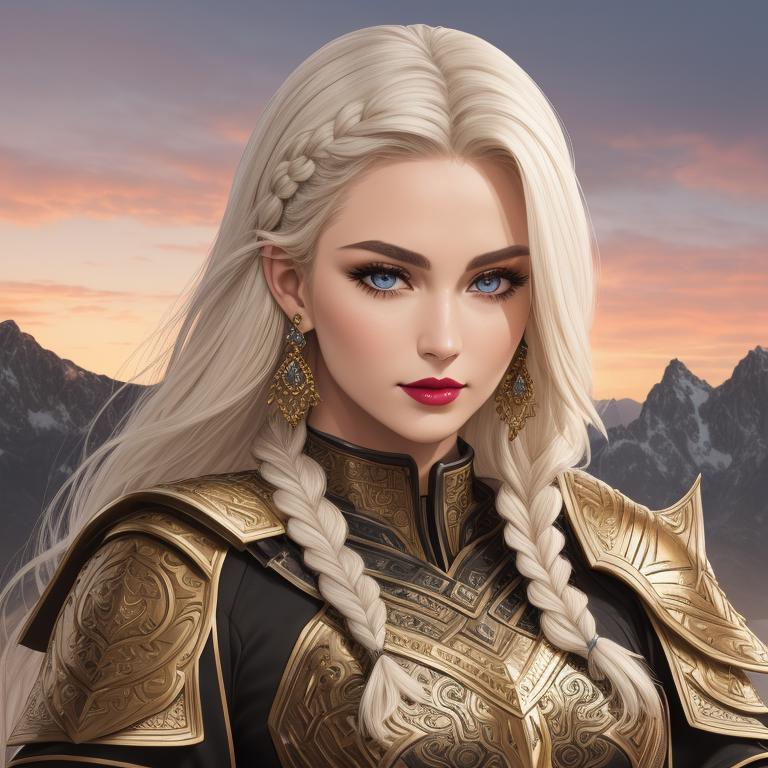 Italian Plate Armor, Gal, Average Height, Narrow ????, Heart-Shaped Face, Fair Skin, Platinum Blonde Hair, blue Eyes, Narrow Nose, Pouty Lips, Receding Chin, Long Hair, Curly Hair, Shaggy Cut, perky ???????, Drop earrings, teal, gloss lipstick, A towering mountain range, where the peaks are crowned with snow and the valleys are home to fierce creatures