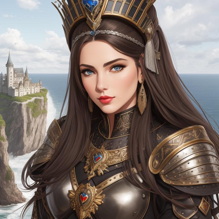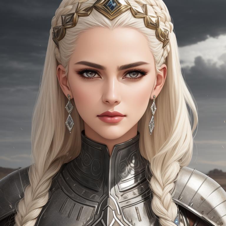 Make a stunning, best quality illustration, German Sallet Helmet Armor, Siren, Average Height, Fit, Square Face, Tan Skin, Honey Blonde Hair, aquamarine Eyes, [[Curved Nose]], Thin Lips, Round Chin, Shoulder-Length Hair, Straight Hair, Sleek Bun, natural ???????, Clip-on earrings, light pink, matte lipstick, A stormy sky looming over a sprawling village