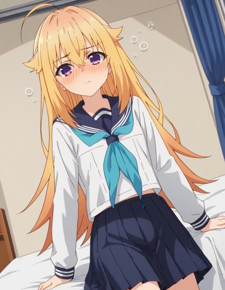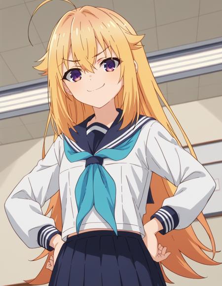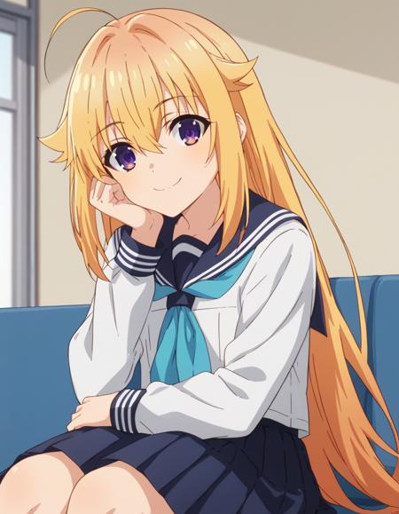 torako koshi, long hair, bangs, blonde hair, hair between eyes, very long hair, purple eyes, ahoge, side locks, hair flaps,