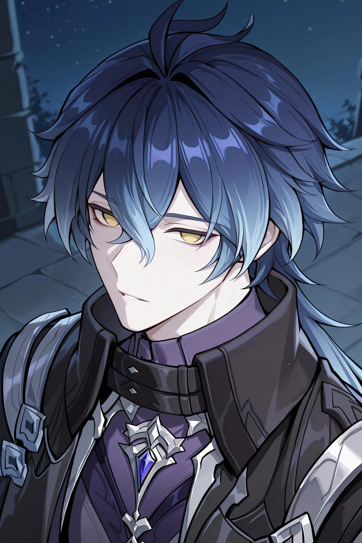 Flins, flins (genshin impact), dark blue hair, gradient hair, light blue hair, yellow eyes, no pupils, hair between eyes, antenna hair, long hair, pale skin(V1):