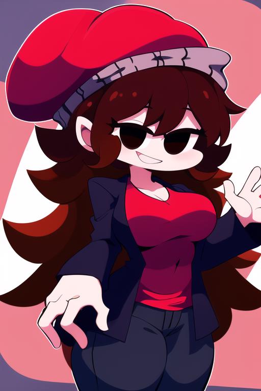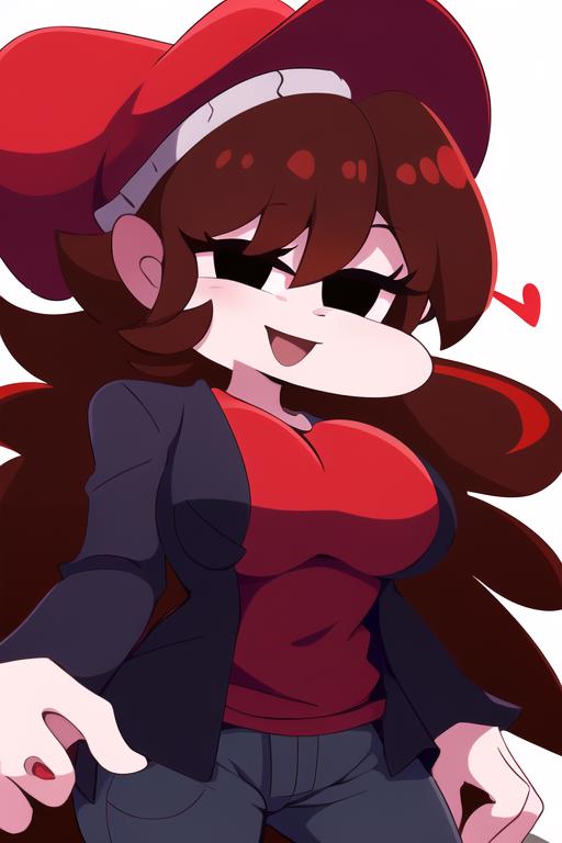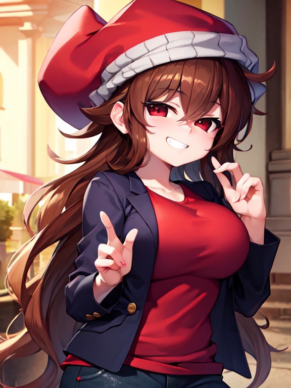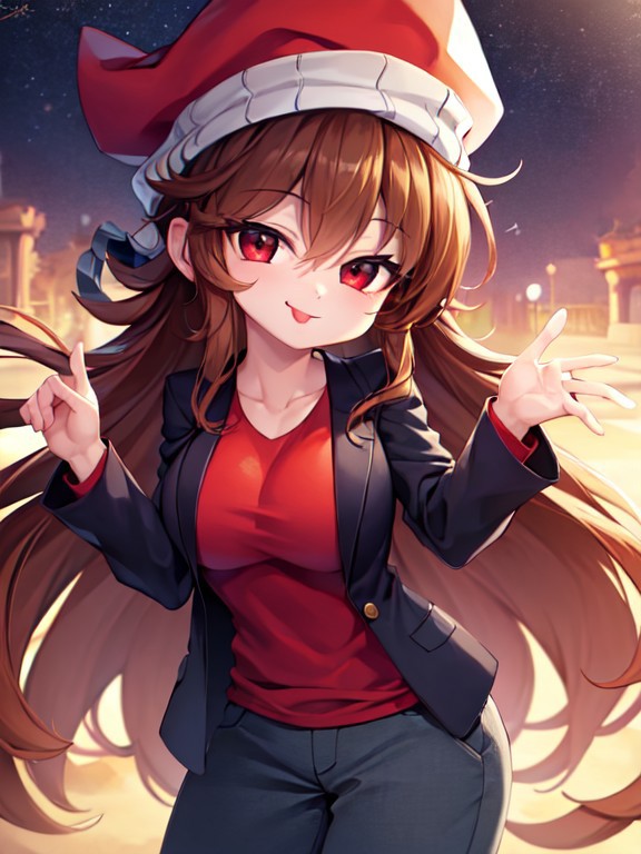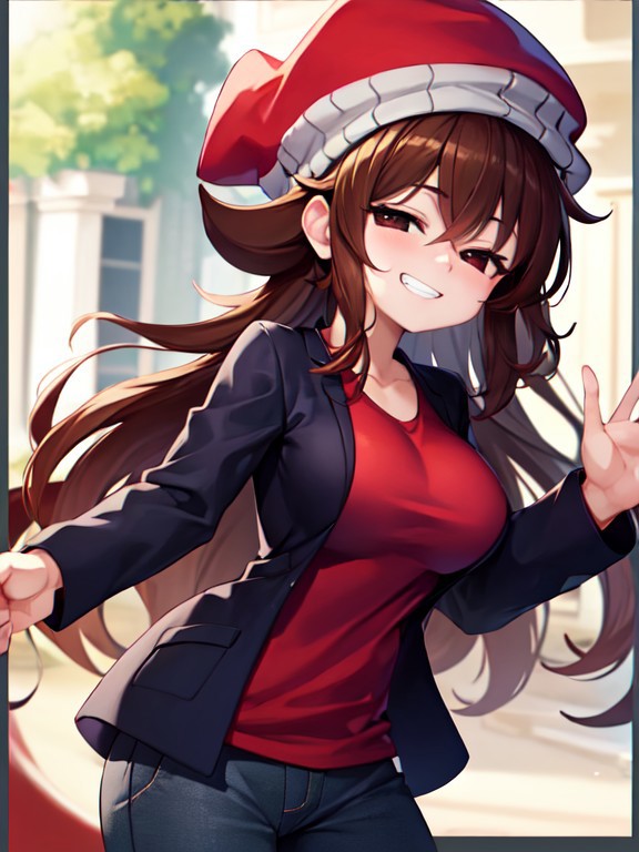 1girl, hat, solo, brown hair, jacket, red headwear, pants, smile, red shirt, black eyes, open mouth, black jacket, large breasts, very long hair
