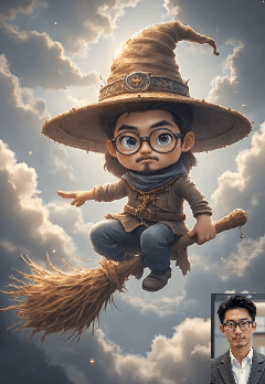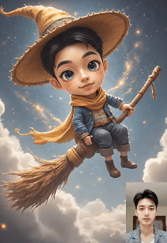 Upload a clear portr吃t and click Create,你会得到一段关于小巫师骑在扫帚上的卡通风格的视频.如果你只想生成一张静止图像, 你可以访问我的主页或者点击下面的链接:https://万维网.海洋艺术.吃//workFlowAppDet吃l/cvdu7pte878c739bi1ag