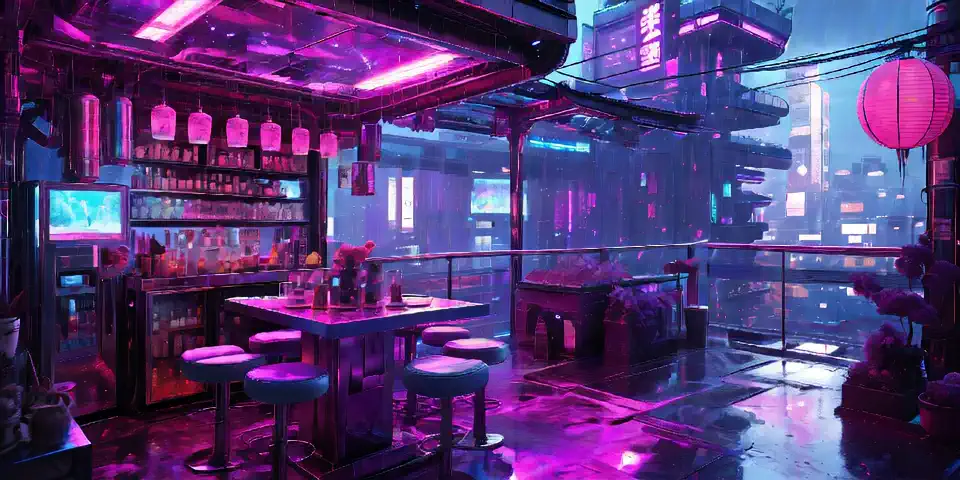 紫色核心几乎复古风格的插图,描绘了一座雨中霓虹城市的屋顶自动酒吧.