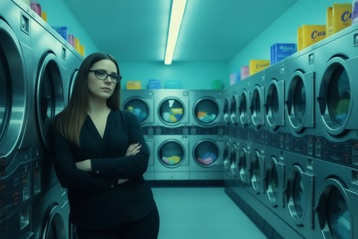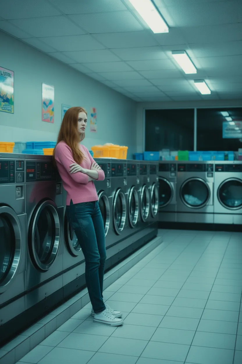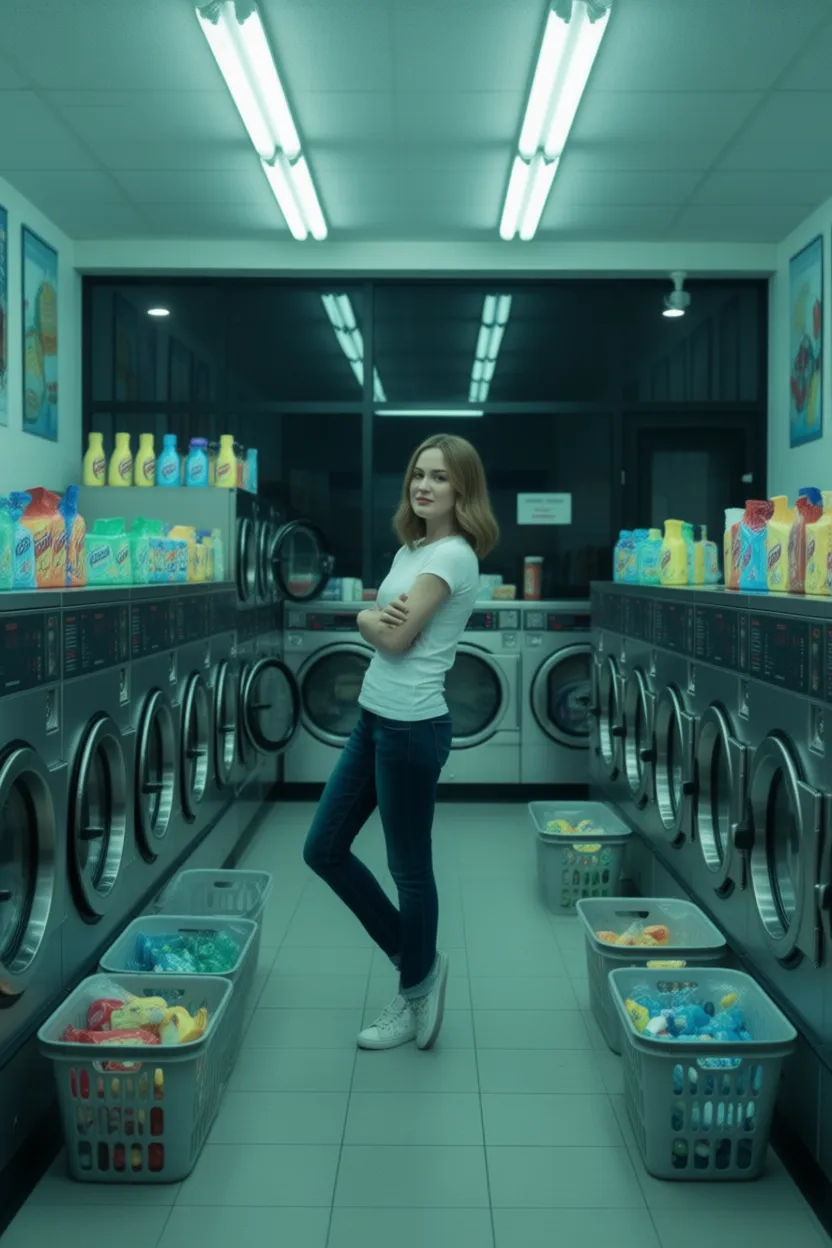洗衣店将你的照片转换成一个生动的复古场景,设置在一个明亮的洗衣店里. 你是中心人物, 靠在一排洗衣机上,周围是色彩缤纷的肥皂盒.