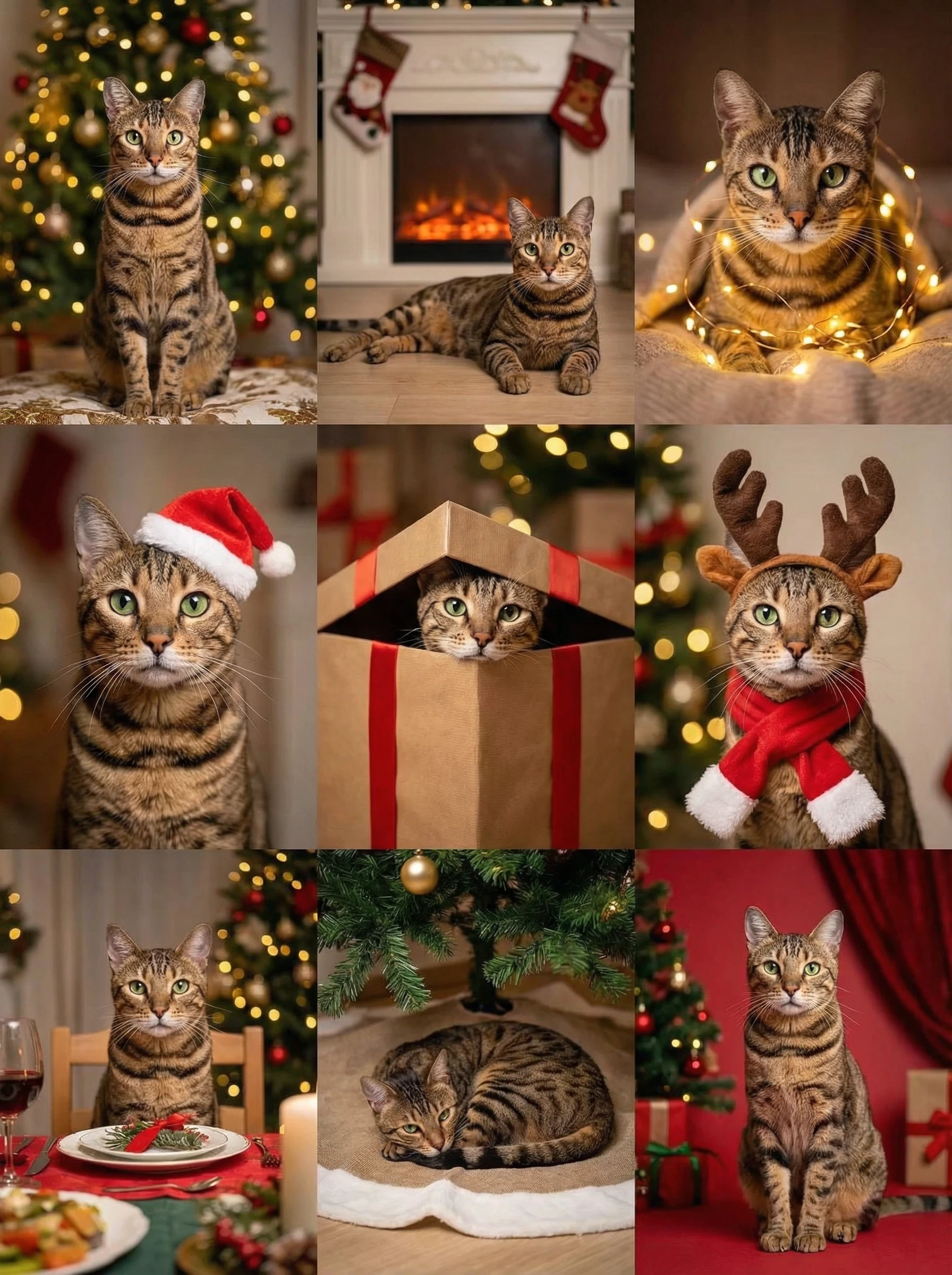 即时创建定制的宠物节日肖像。可添加个性化元素与节日背景,获得具有插画质感的图像,充分呈现节日氛围。支持制作最大 8×10 英寸的贺卡,适合打印或数字分享。