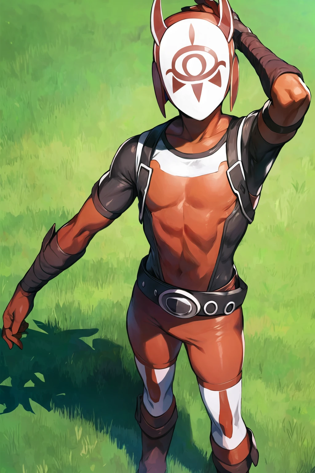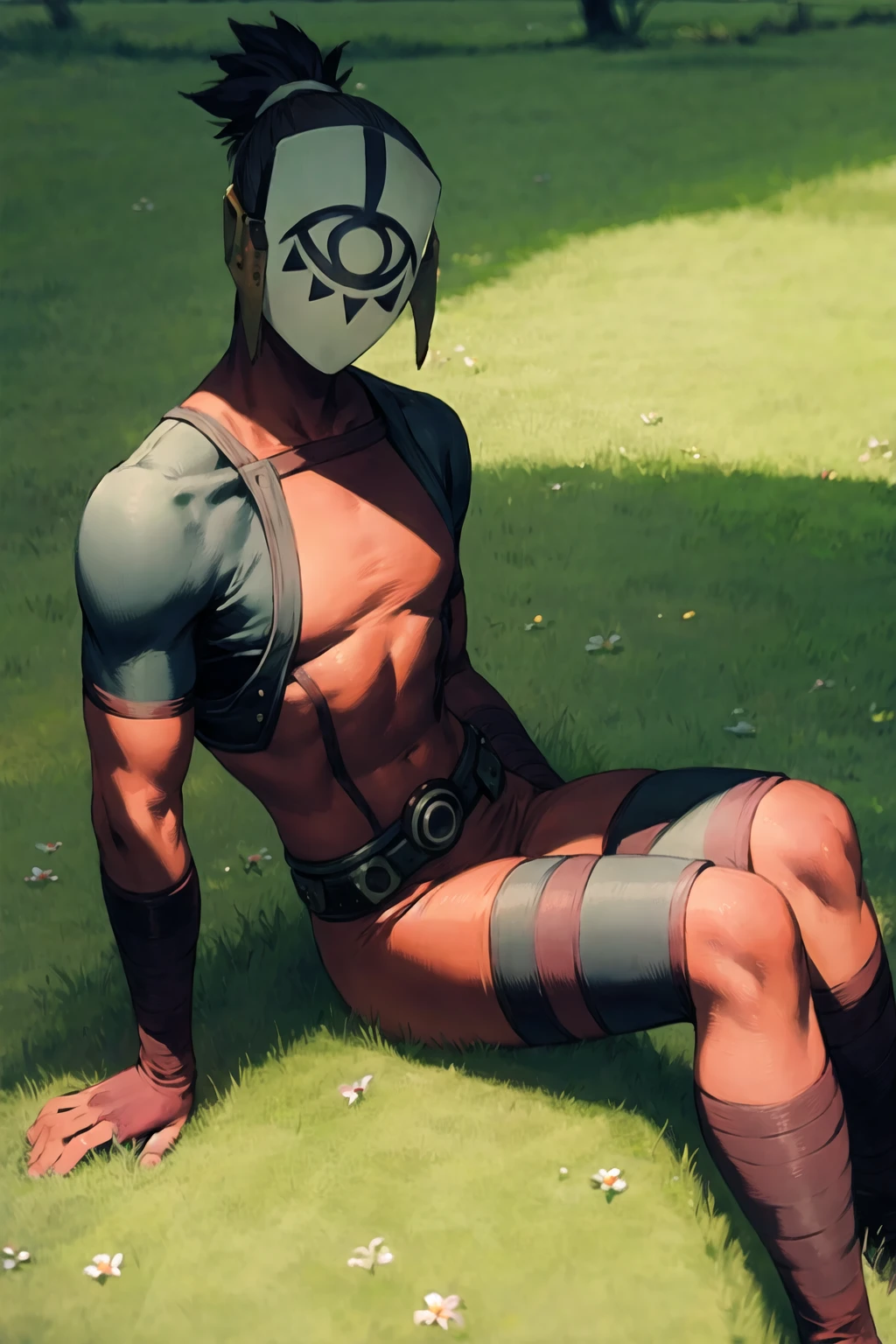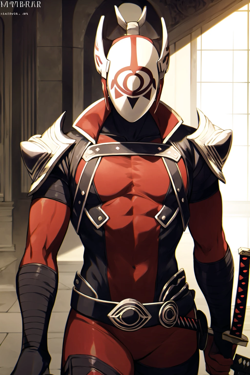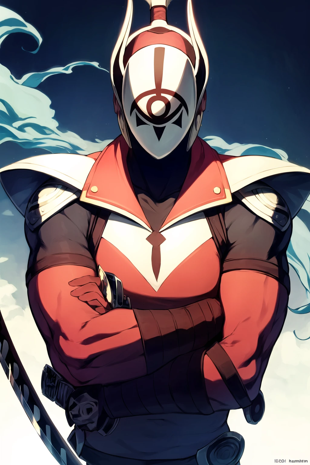 mask, white mask, red ????????, ????????, red ????????, brown belt, ponytail, high ponytail, short ponytail, armor, ninja, belt, boots, gloves, red gloves, elbow gloves, bandaged arm, samurai, ??????, ?????? weapon, sickle, helmet, horns, covered face, eye print