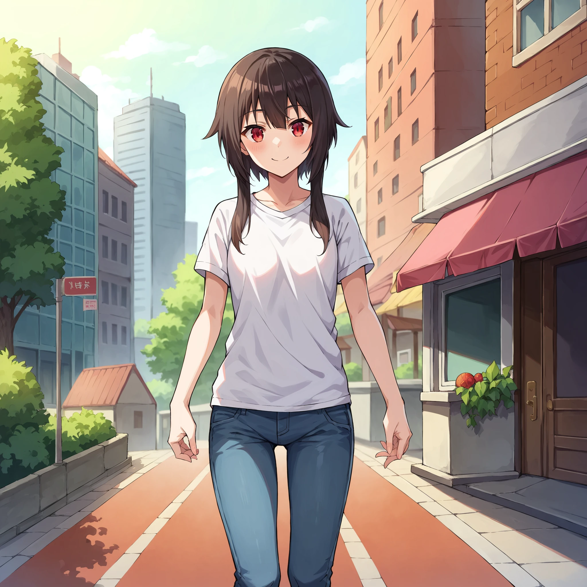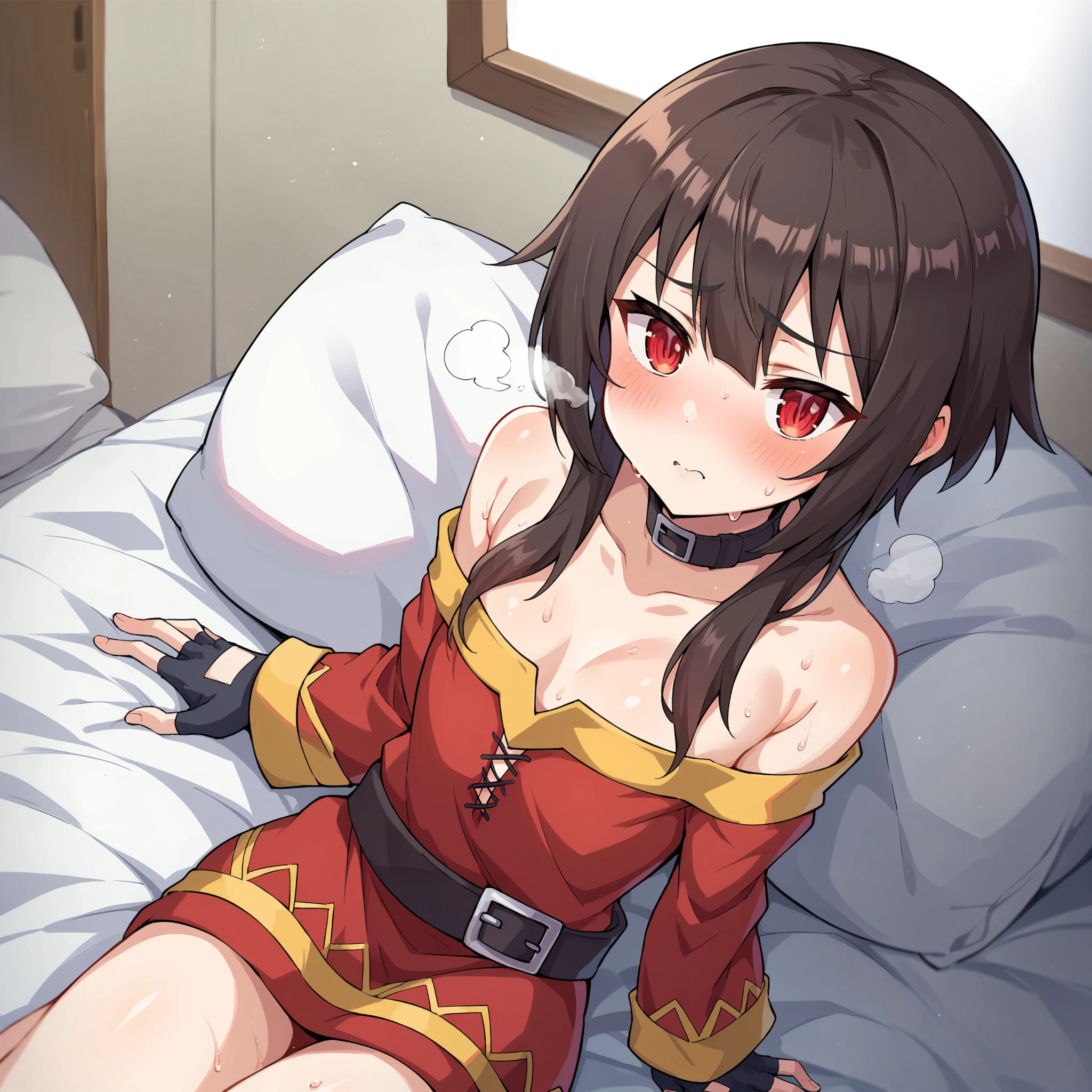 megumin, short hair, black hair, red eyes, side locks, long locks