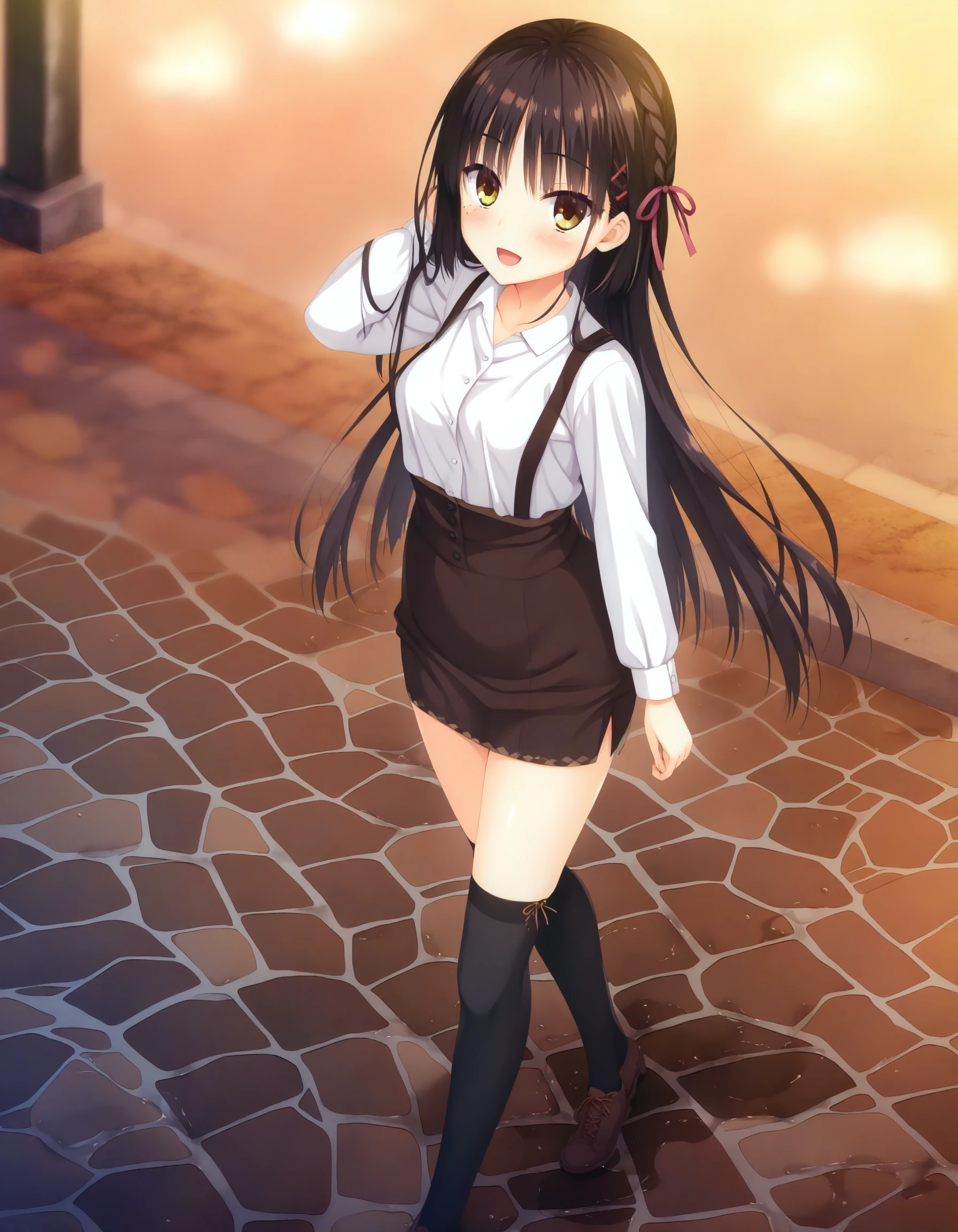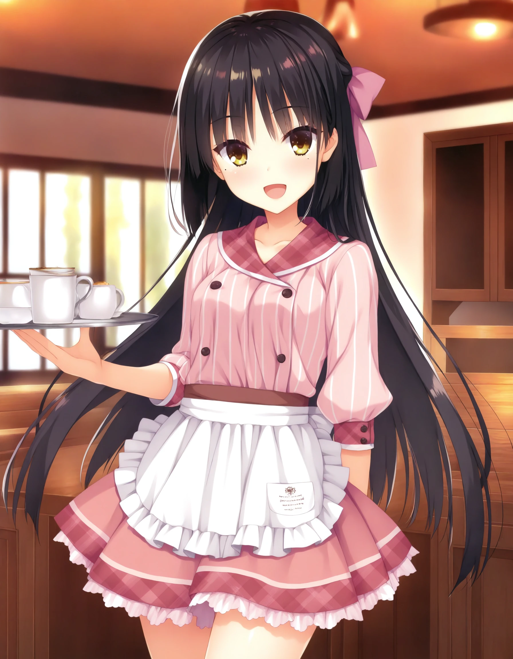 shiki natsume, cafe stella to shinigami no chou, muririn, very long hair, black hair, braid, hair ribbon, hair ornament,  bangs, blunt ends,  yellow eyes, mole under eye,