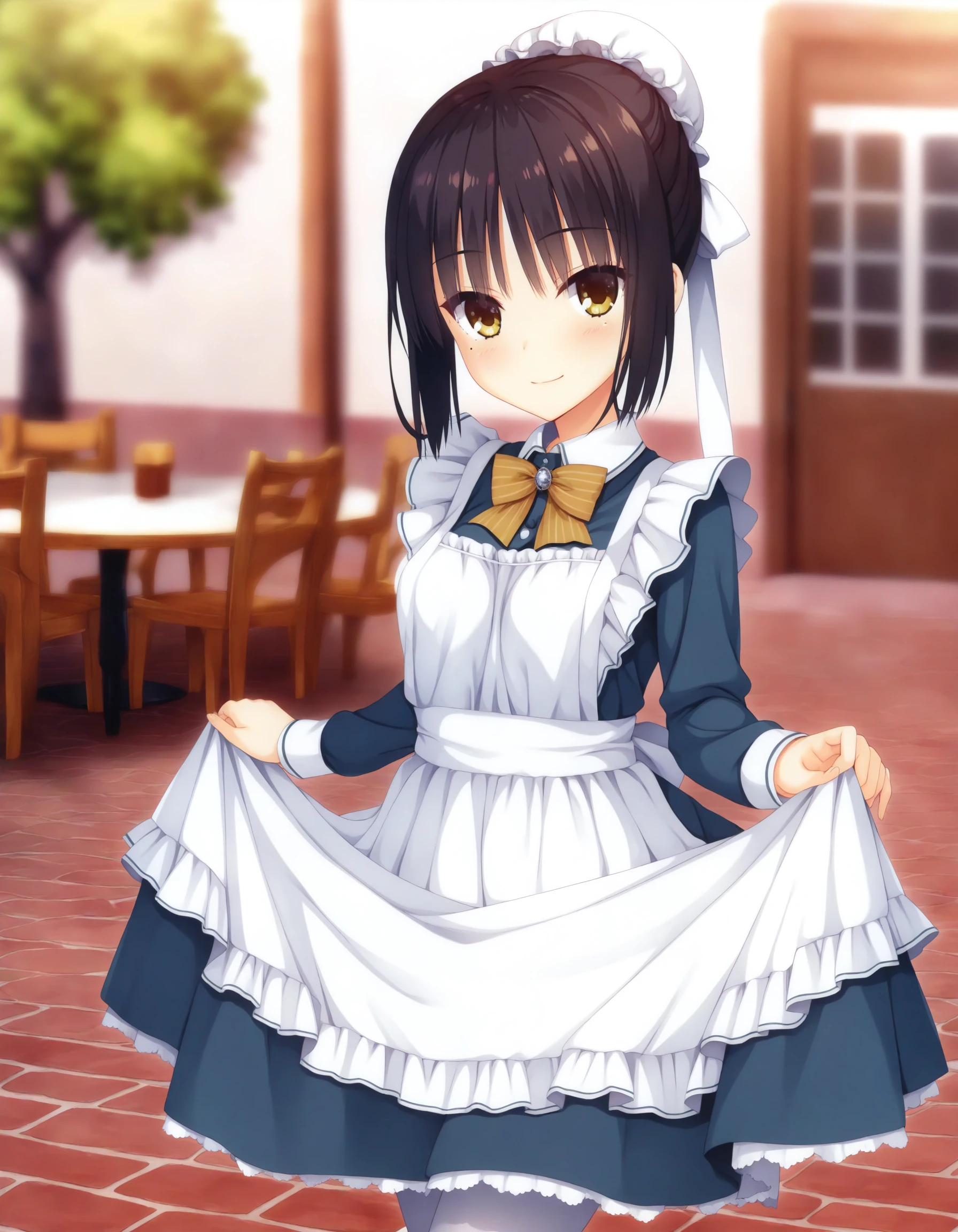 maid, dress,long sleeves, frills,  yellow bowtie, apron, black dress, blue dress, maid apron, white apron, white pantyhose,