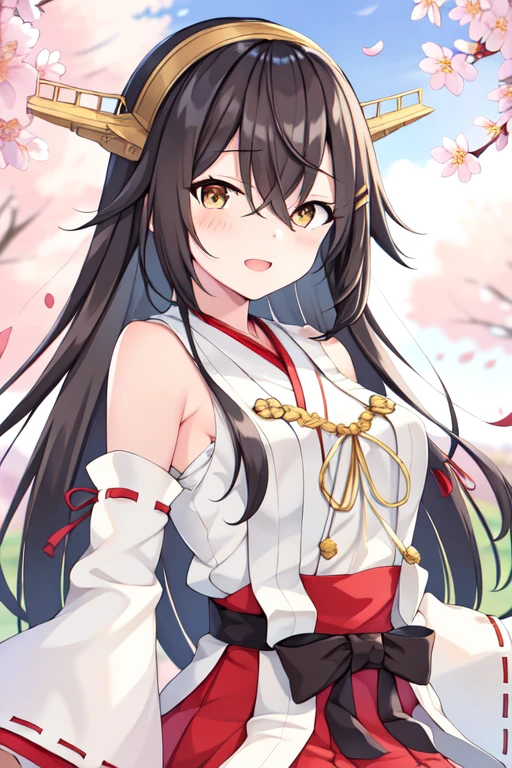 Default Outfit : harunakainiKC, long hair, skirt, hair ornament, hairband, detached sleeves, japanese clothes, hairclip, red skirt, headgear, ribbon trim, nontraditional miko, ribbon-trimmed,thighhighs,