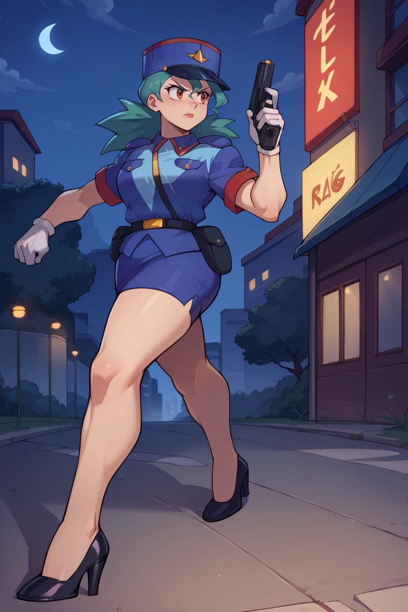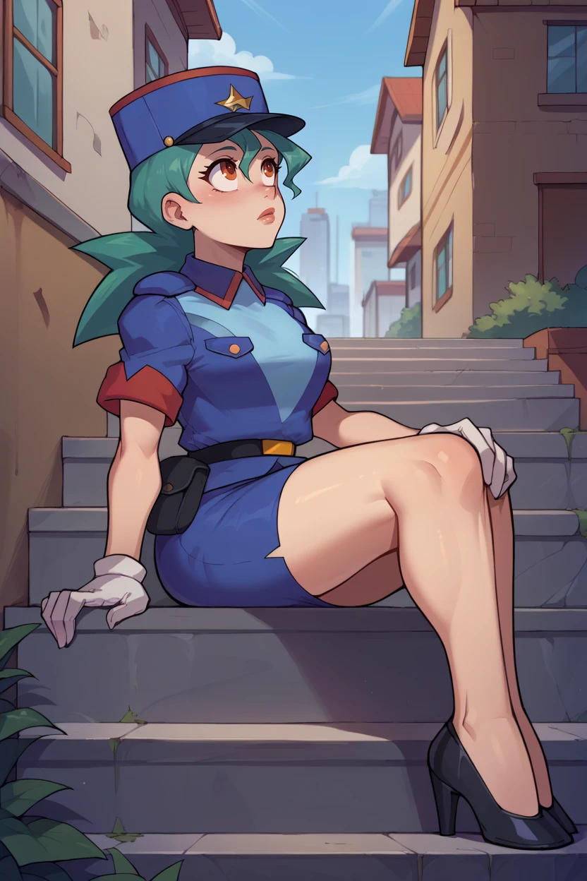 blue hat, star hat, police uniform, blue shirt, short sleeves, belt, pencil skirt, white gloves, high heels