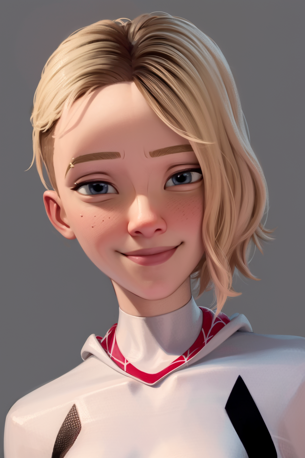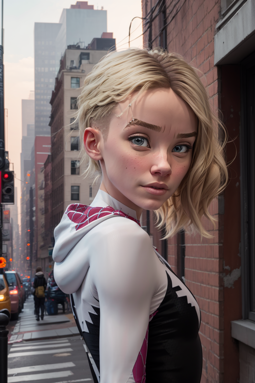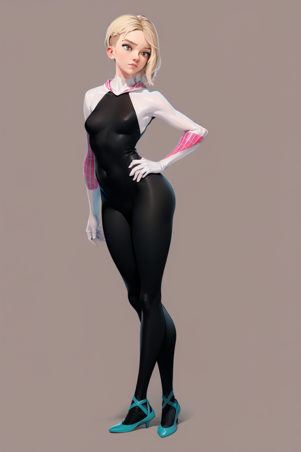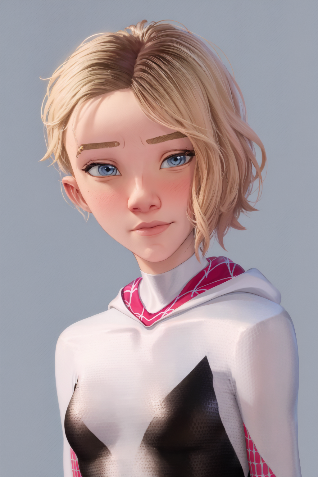Other prompts : blonde hair, short hair, asymmetrical hair, blue eyes, hooded ????????, eyebrow piercing, spider web print, ballet slippers