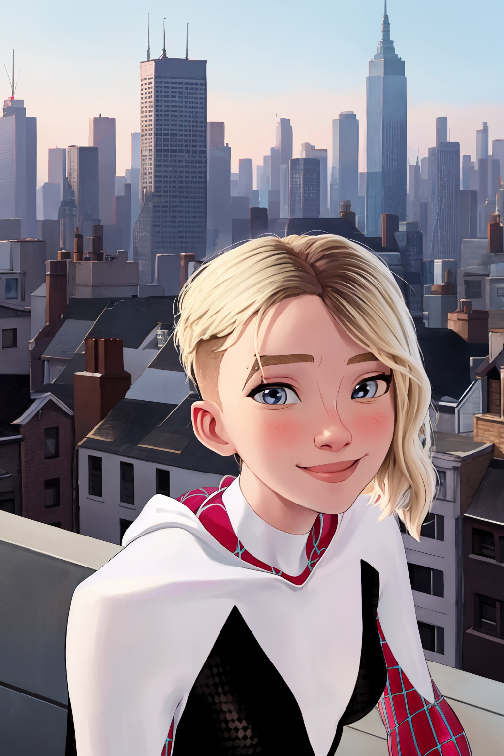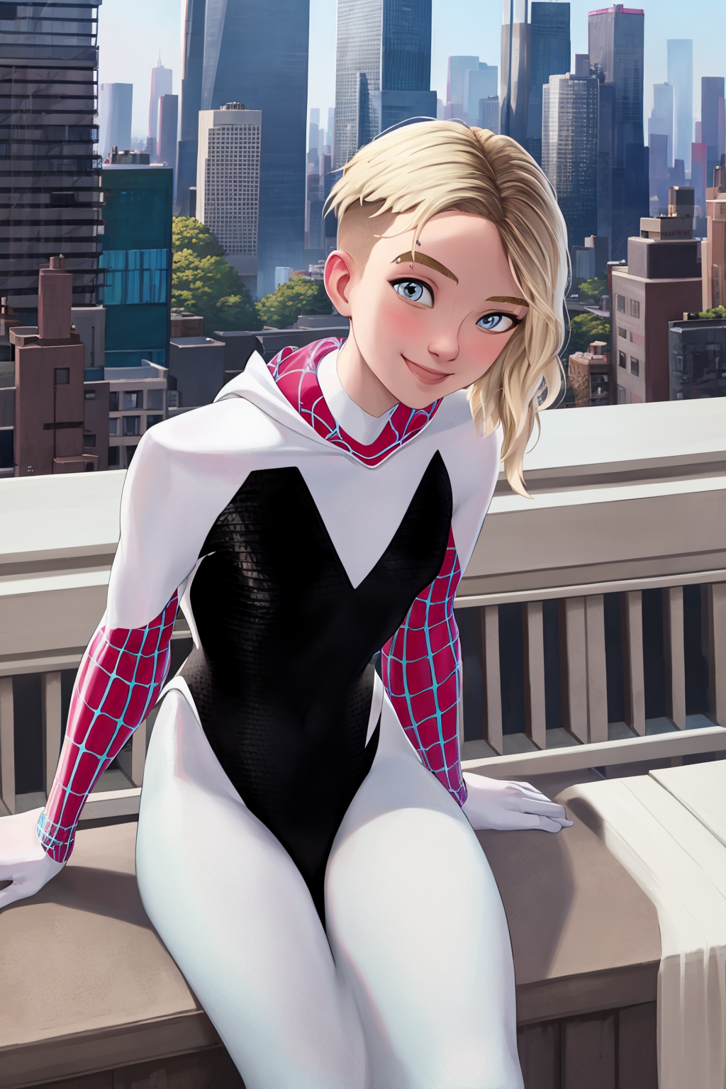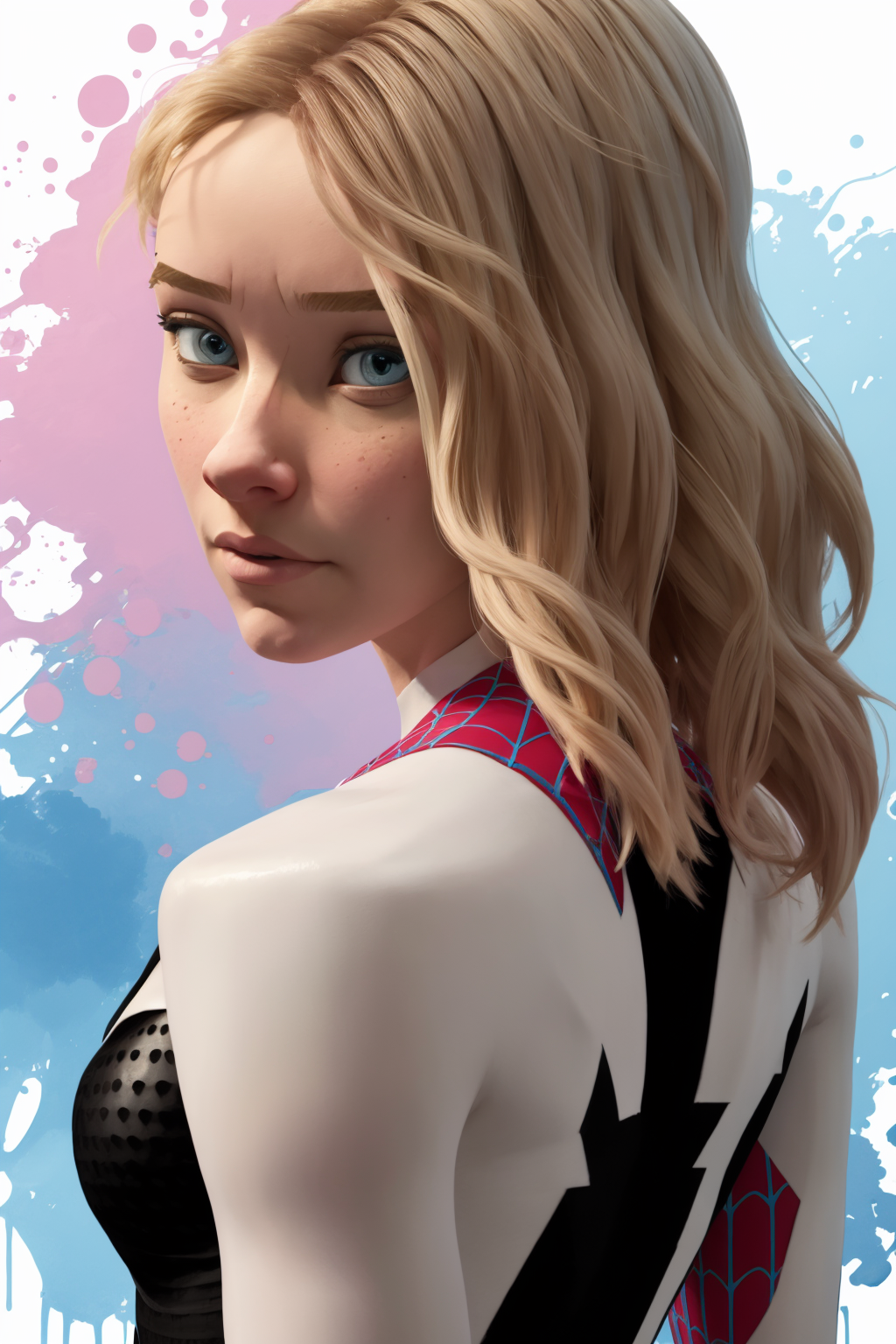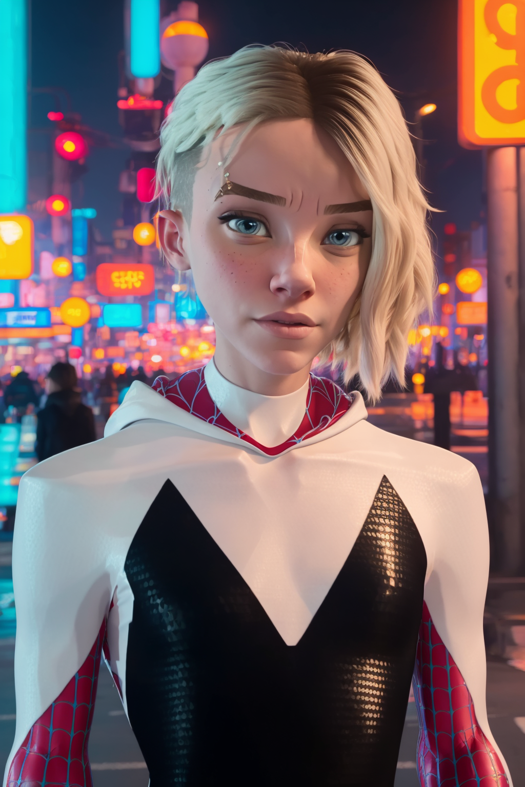 Other prompts : blonde hair, short hair, asymmetrical hair, blue eyes, hooded ????????, eyebrow piercing, spider web print, ballet slippers