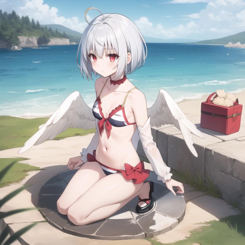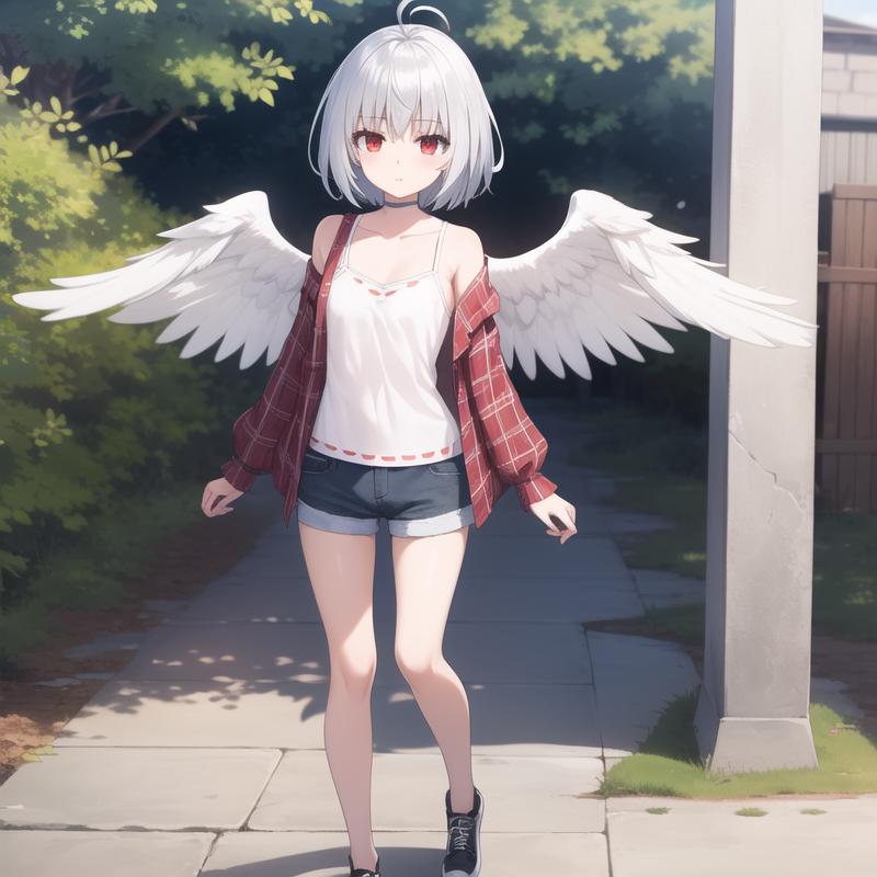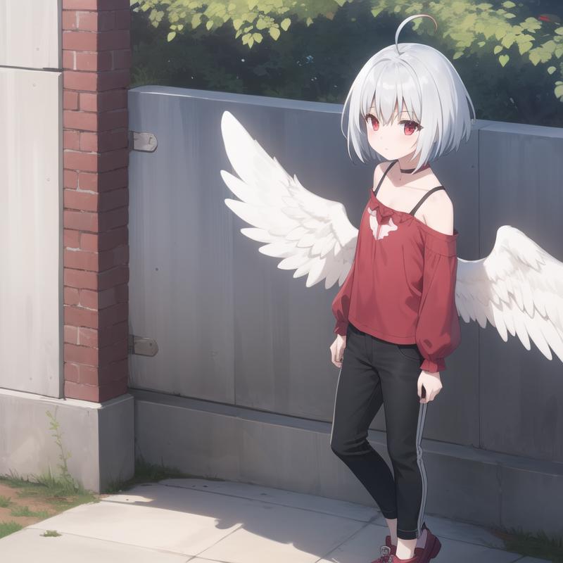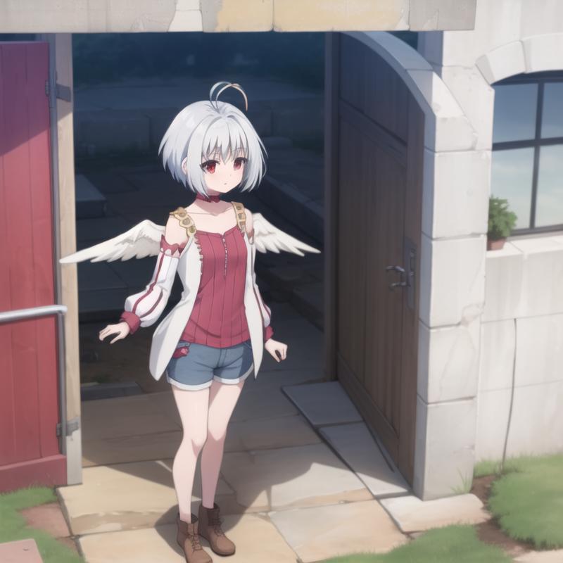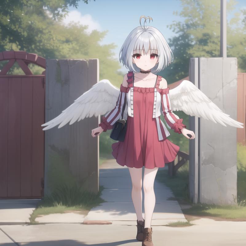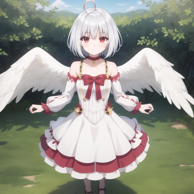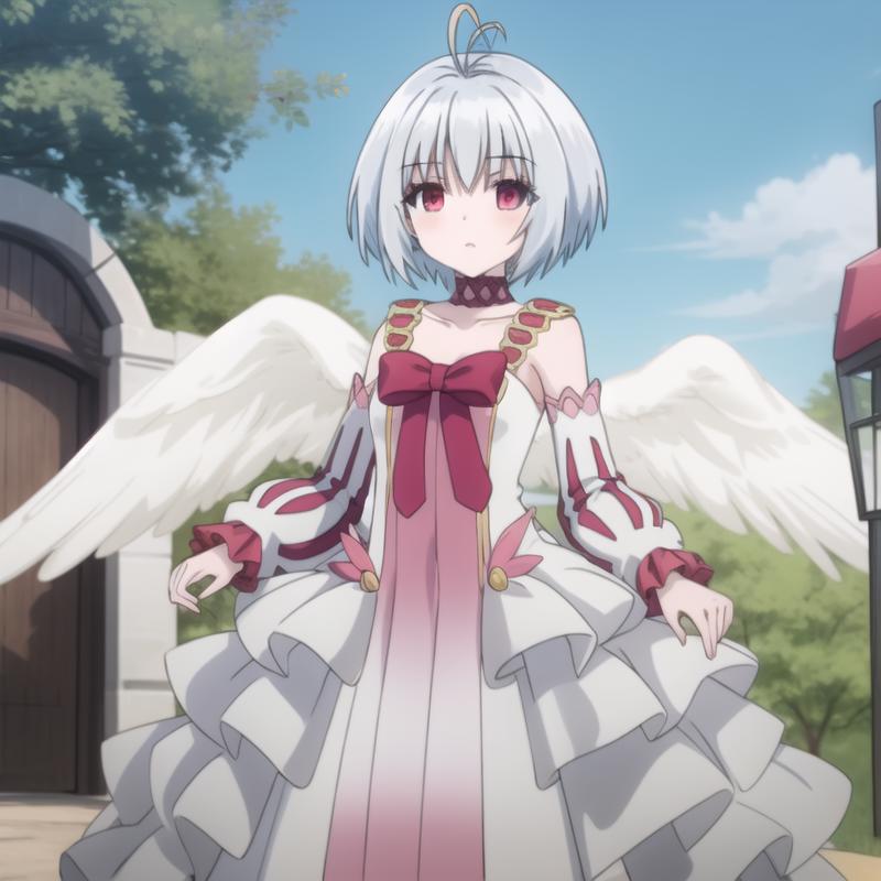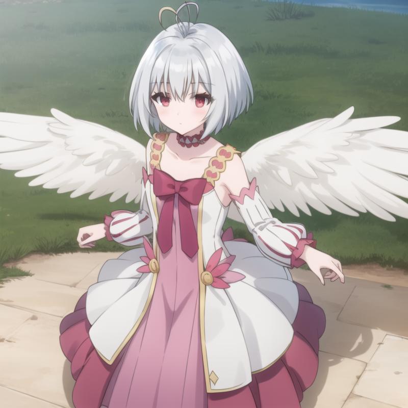 Trigger Word: tny-fitoria, short hair, silver hair, red eyes, white wings, pink dress, frilled dress, ahoge, antenna hair