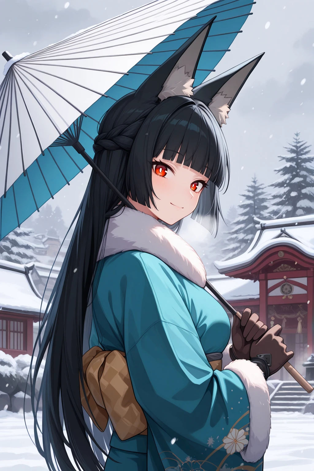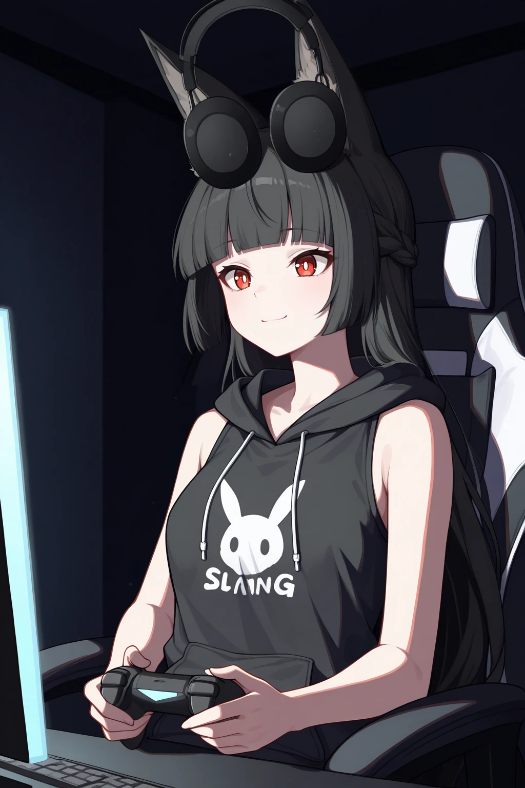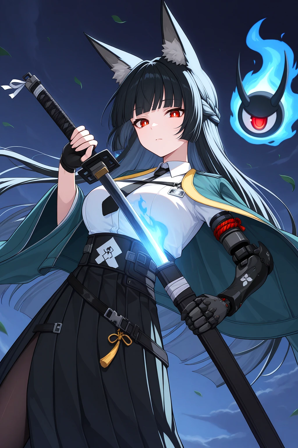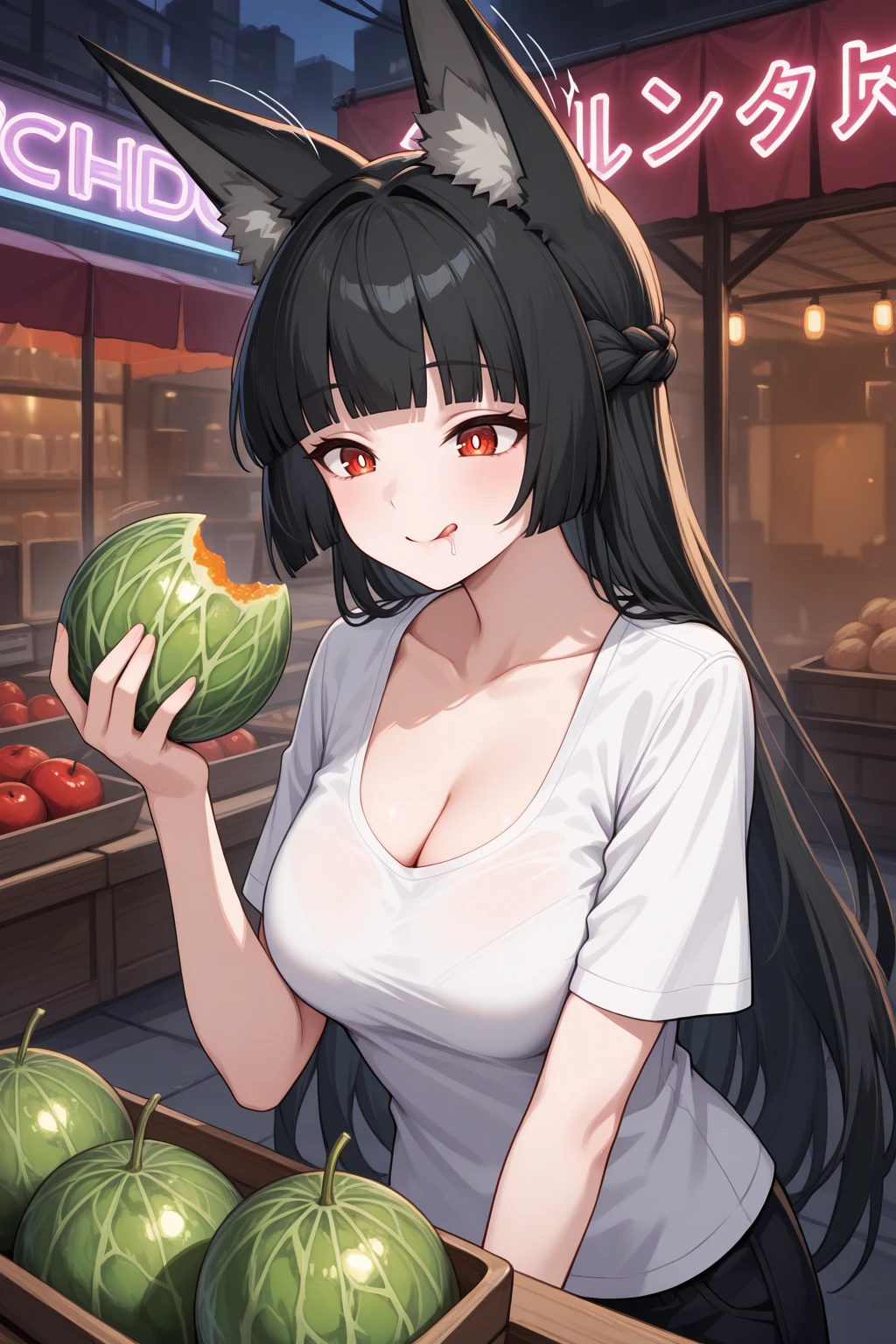 hsmyb, animal ears, animal ear fluff, red eyes, white pupils, bright pupils, black hair, long hair, blunt bangs, sidelocks, half up braid, medium breasts