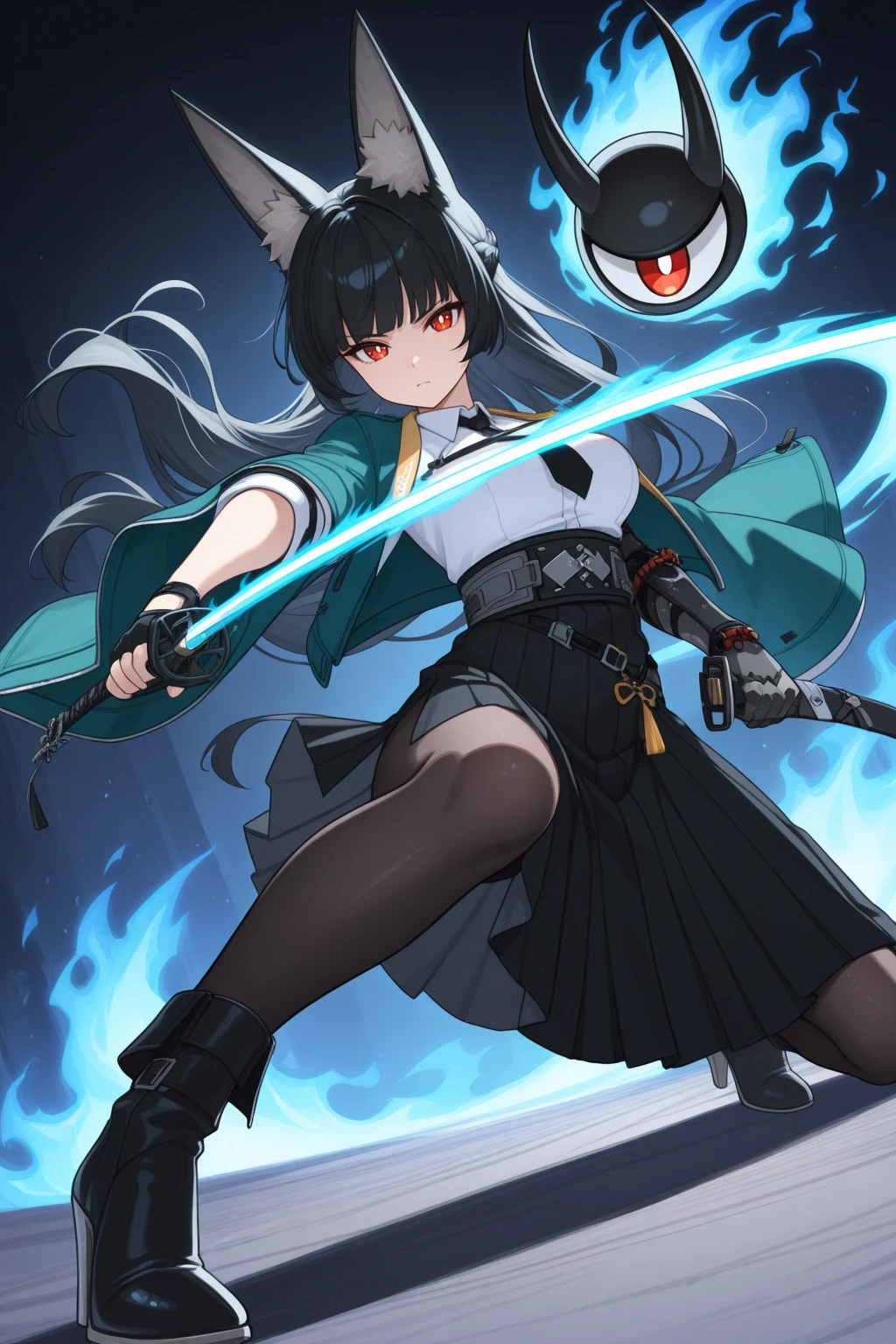 green jacket, open jacket, wide sleeves, chest strap, id card, white collared shirt, black necktie, arm strap, high-waist skirt, black skirt, long skirt, pleated skirt, belt, tassel, black pantyhose, black boots, high heel boots, single fingerless glove, black gloves, single mechanical arm