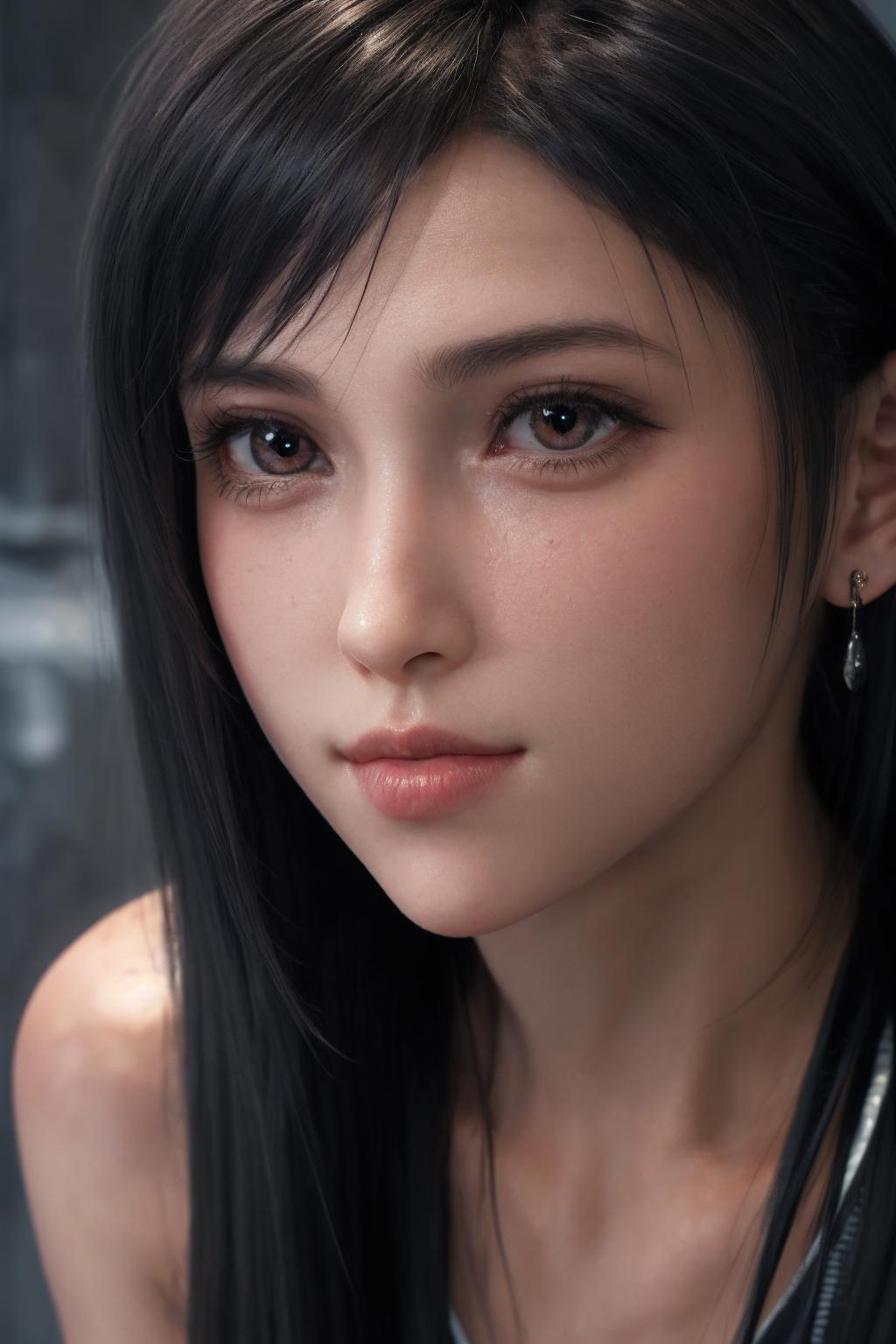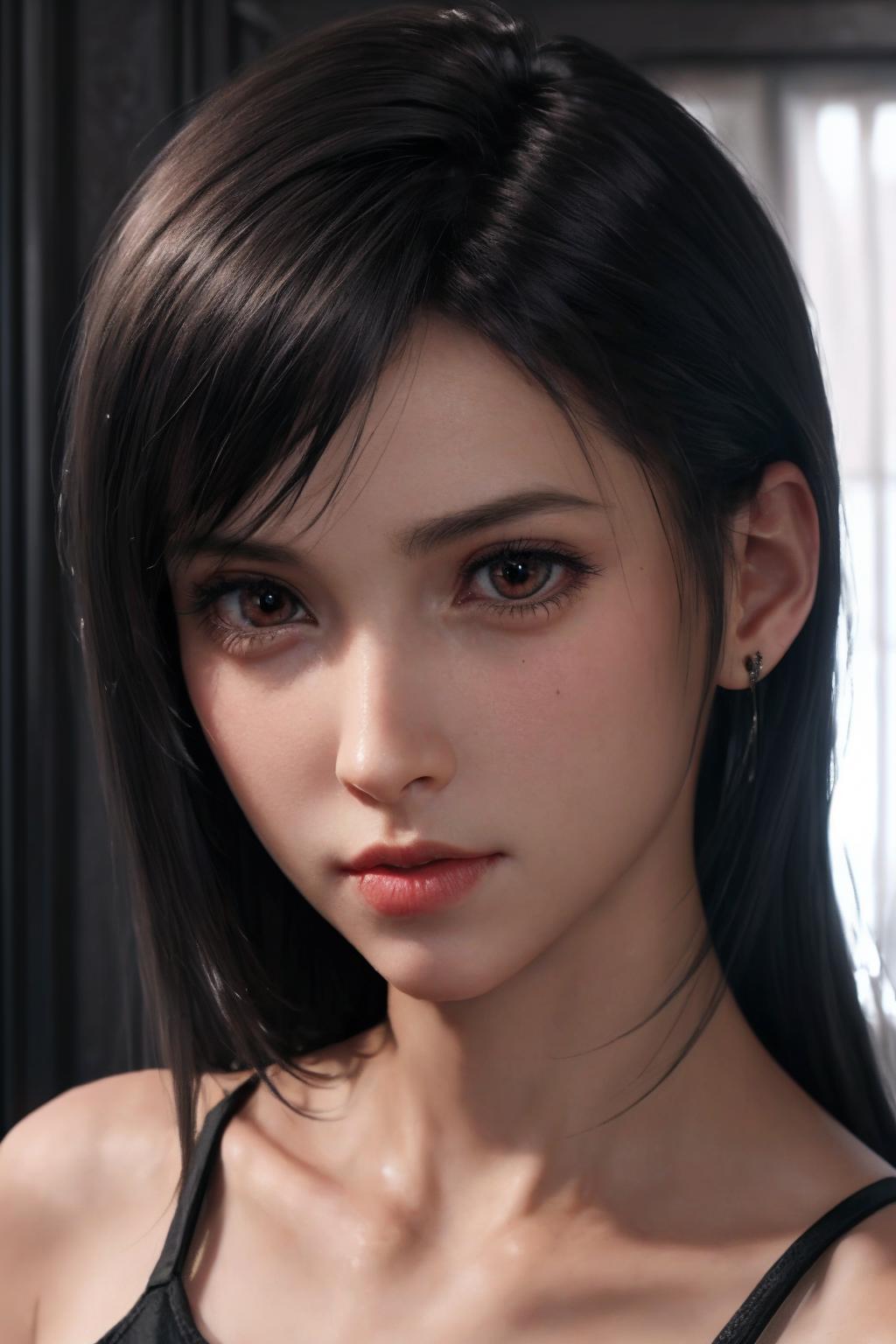 prompt : tifa, final fantasy 7 remake, (mature female), milf, shade of brown hair, wind. very white skin,pale skin, masterpiece, ultra realistic 8k cg, very long hair, beautiful , , reddish brown eyes, ????????????, left only earpiece, stick earpiece, red earpiece, {one earpiece}, left earpiece, shiny skin, clean, beautiful face, pure face, pale skin, long hair, (????????????, beautiful ???????, ), shiny skin, ?????????????, (((((black swimsuit, ))))),