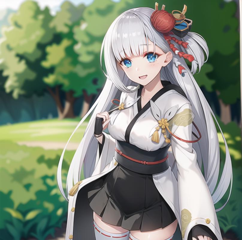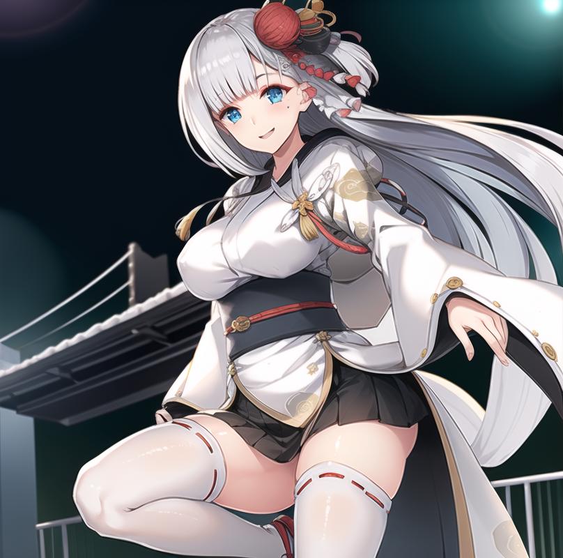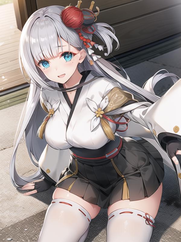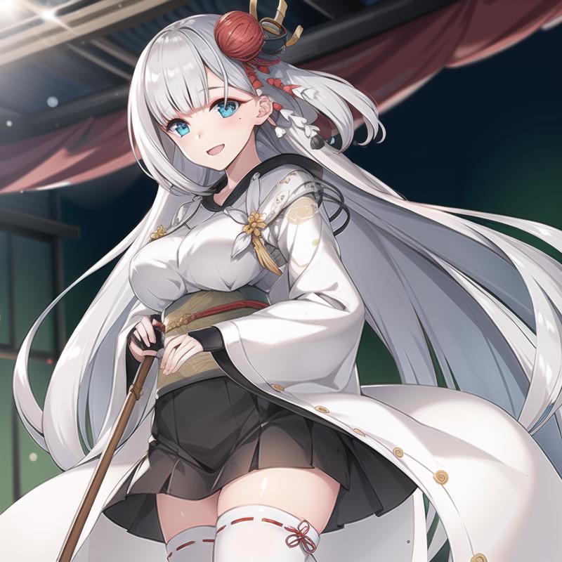 Shoukaku,white hair, long hair,ons side hair ornament, blue eyes, kimono, miniskirt, obi,white thighhighs, geta,fingerless gloves