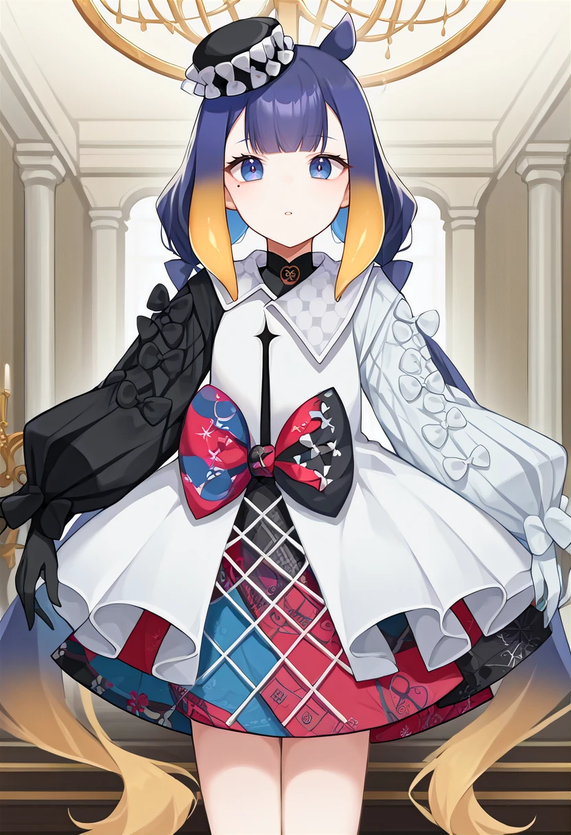 inacolorful, multicolored clothes, mini hat, asymmetrical sleeves, asymmetrical gloves, mole under eye