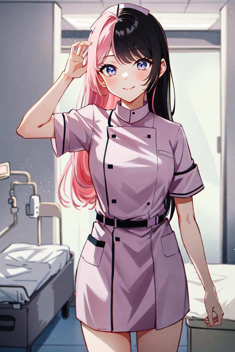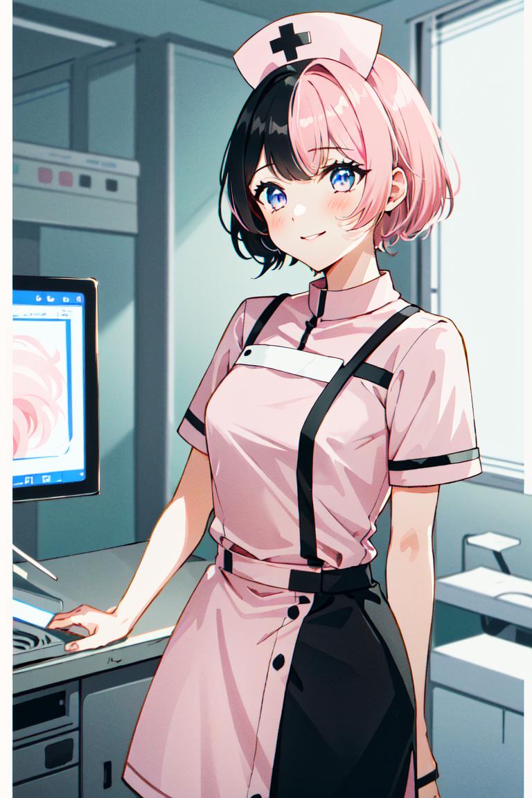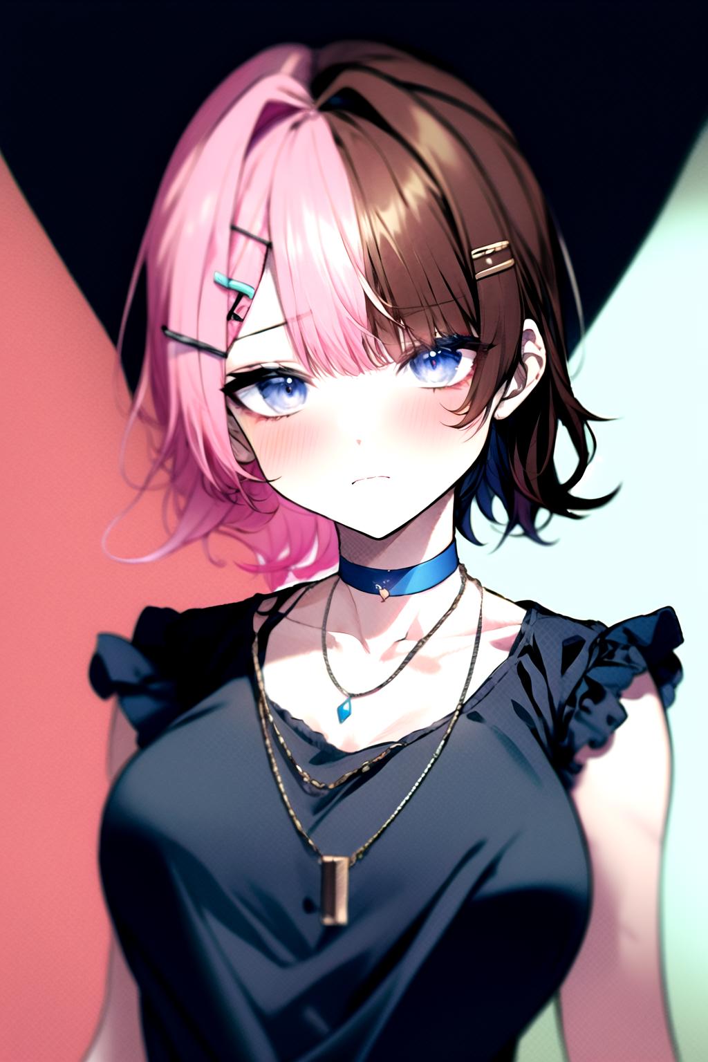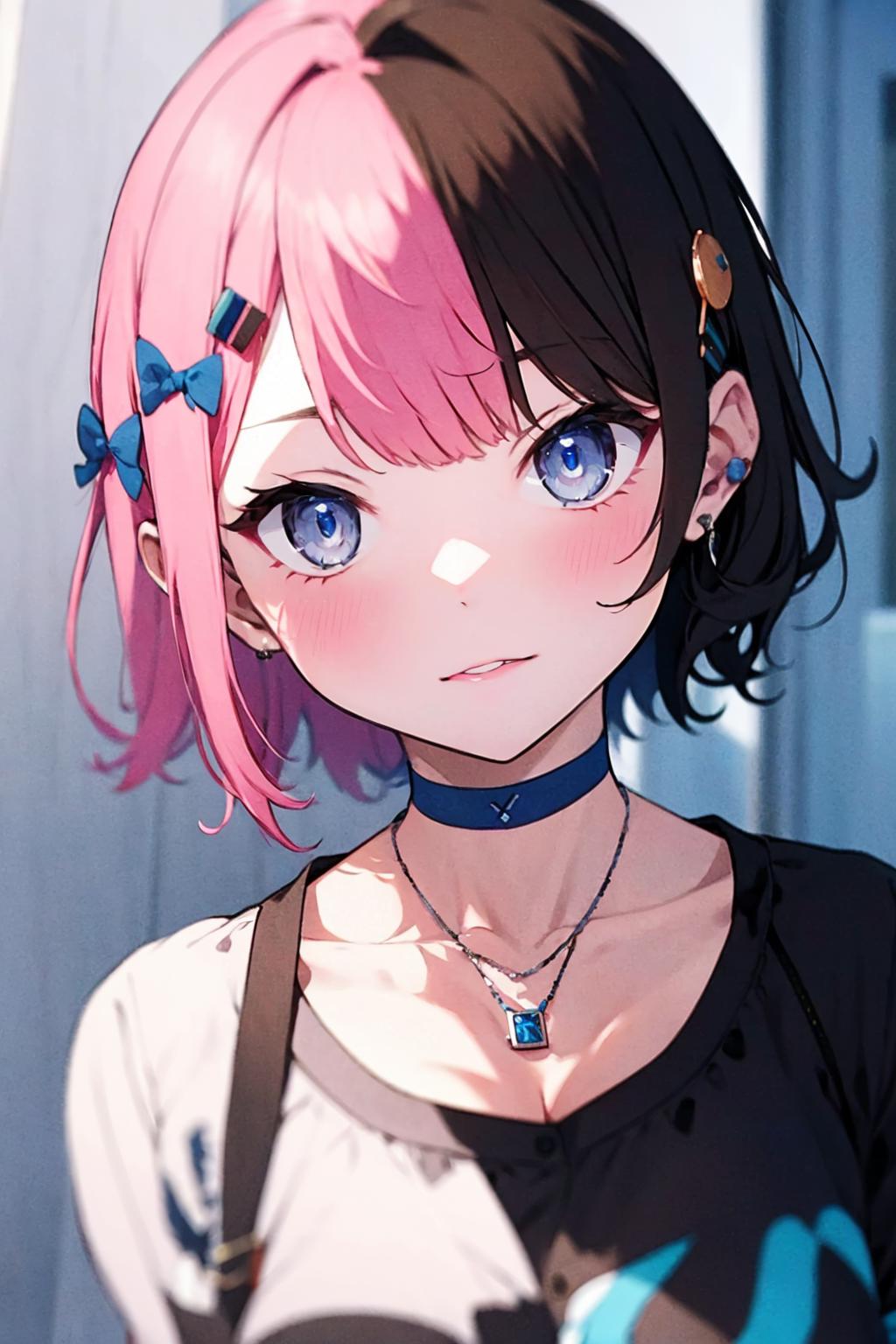 TachibanaHinano, short hair, medium breasts, (split-color hair, black hair, pink hair:1.3), blue eyes