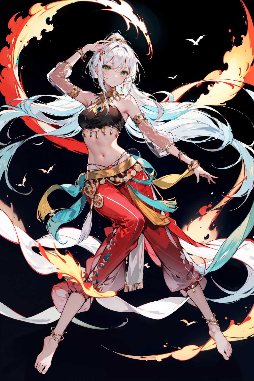 这其实是一个关于舞娘的模型,专门用来描绘那种充满异域风情的舞娘,我很喜欢这一类的元素,但是对于二次元插图来说这类的图还蛮少的,我最后还是找遍了p站,东拼西揍才搞出了这个训练集。因为训练集里面有很多桃子的图,所以画风会稍微有点点momoco味。