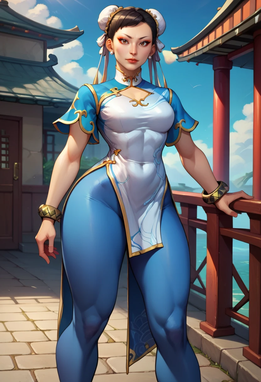 Character prompt: chunliSDXL, 1girl, solo, ???????, looking at viewer, black hair, dress, brown eyes, jewelry, earrings, pants, hair bun, black footwear, bracelet, double bun, makeup, chinese clothes, china dress, blue pants, tight, leggings, tight pants, flats,