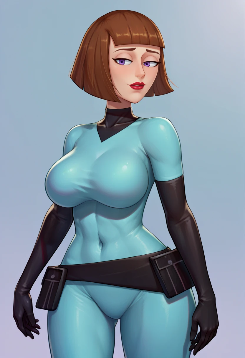 Maddie Fenton,1girl,solo,looking at viewer,short hair,mature female,large breasts,brown hair,purple eyes,black gloves,elbow gloves,blunt bangs,bodysuit,covered navel,turtleneck,bob cut,lipstick,skin tight,loose belt,belt,