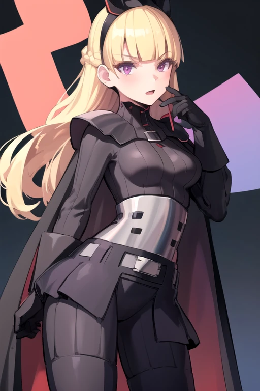AmSW, 1girl, solo, long hair, blonde hair, black gloves, purple eyes, black hairband, cape, black bodysuit, medium breasts, braid, blunt bangs,