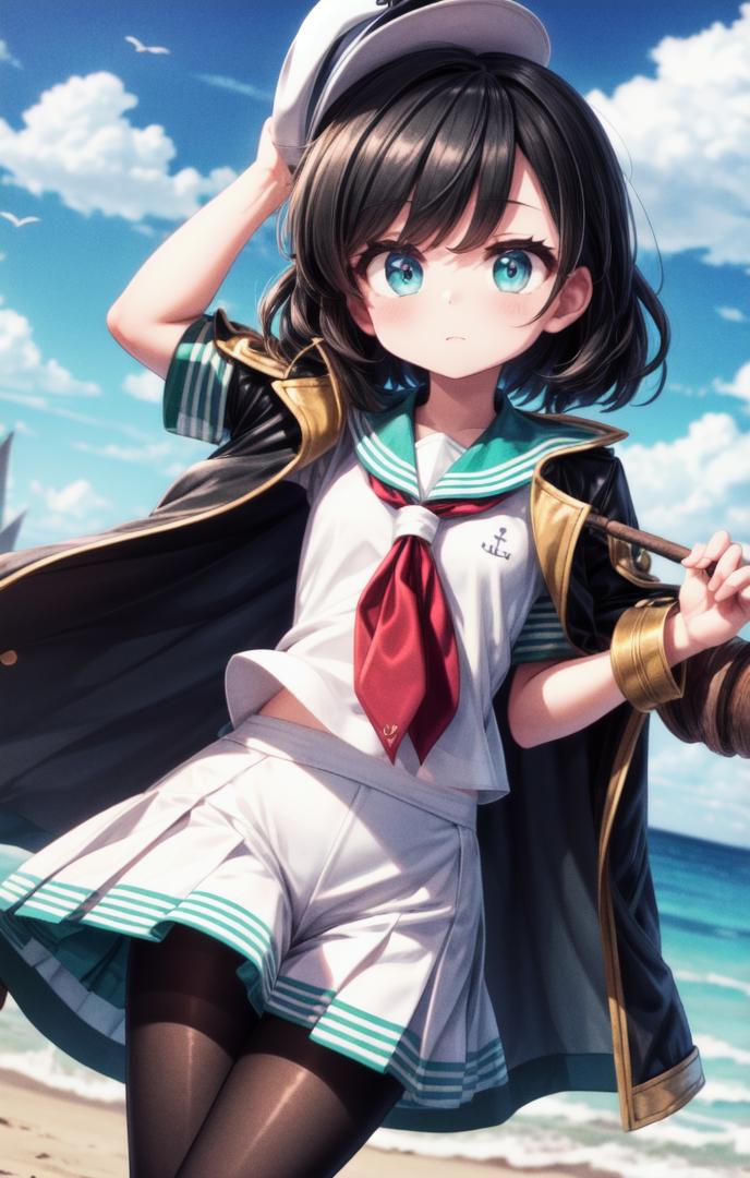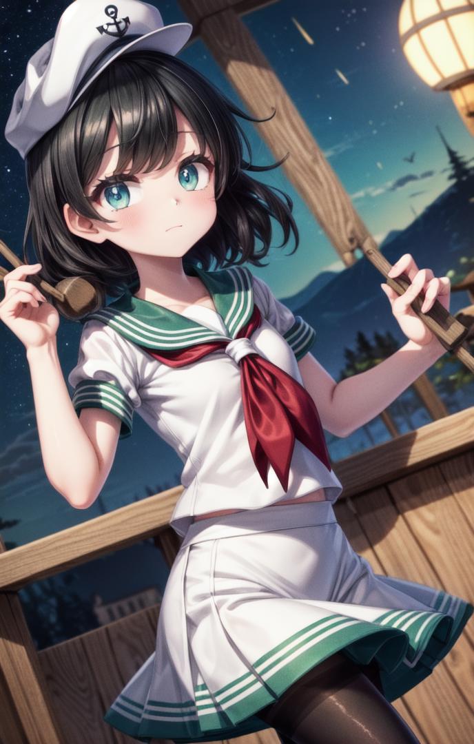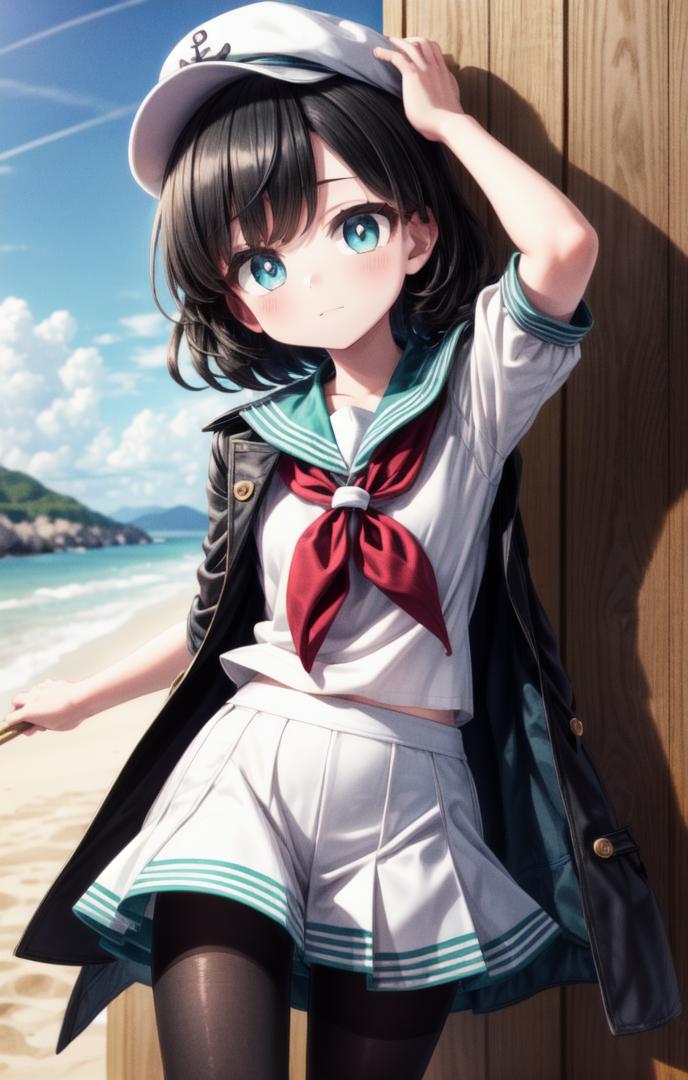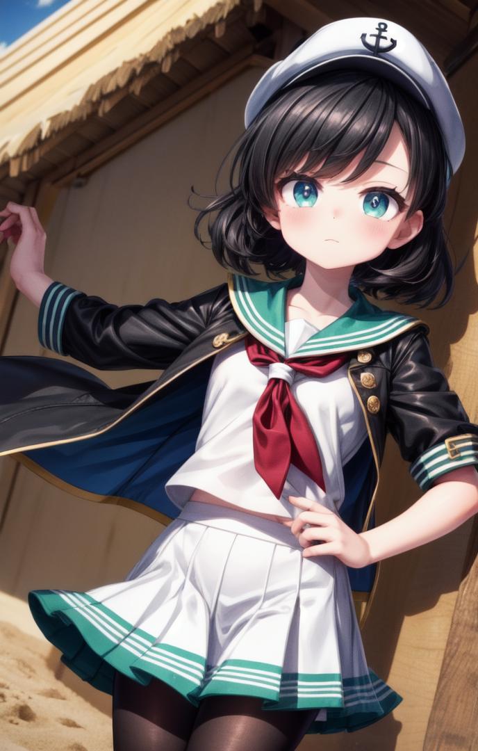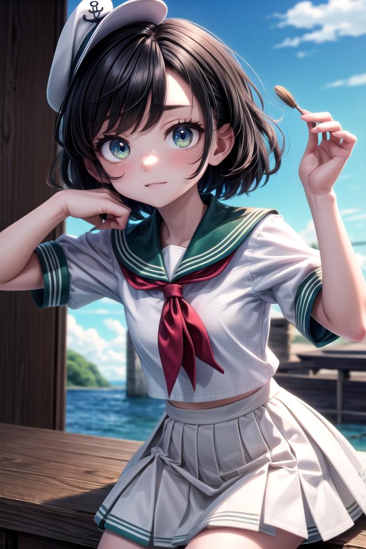 1girl,hat,sailor,gren eyes,short hair,black hair,sailor collar,white shirt,white skirt,