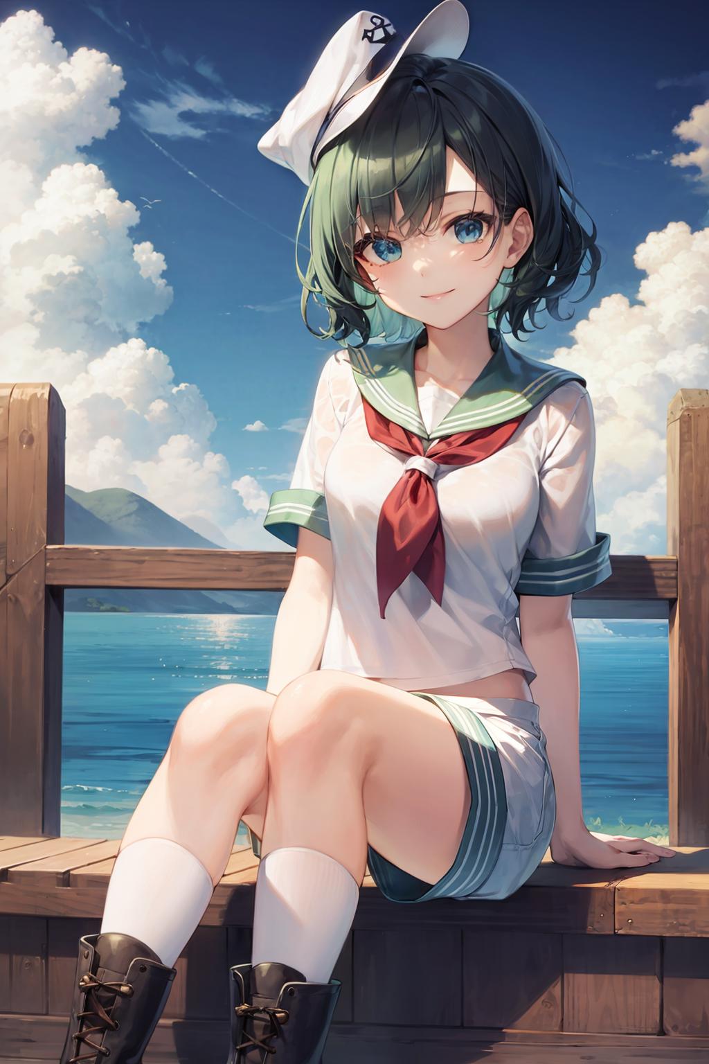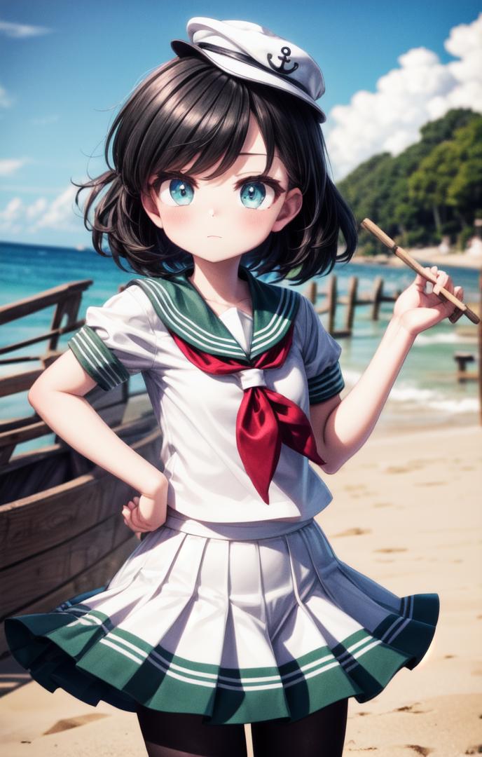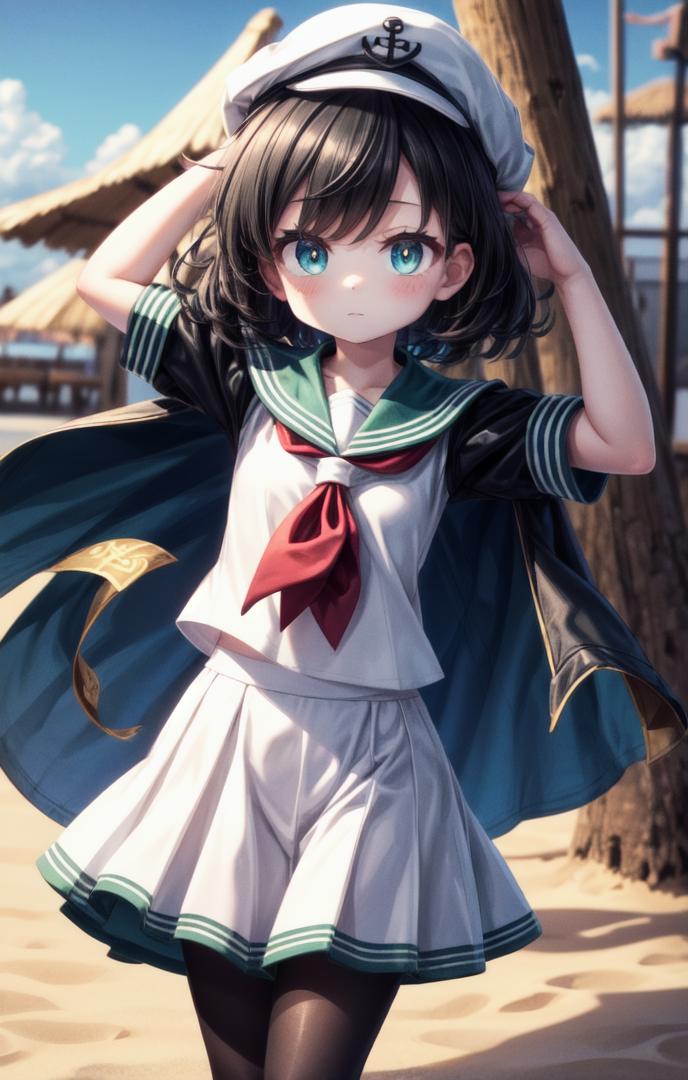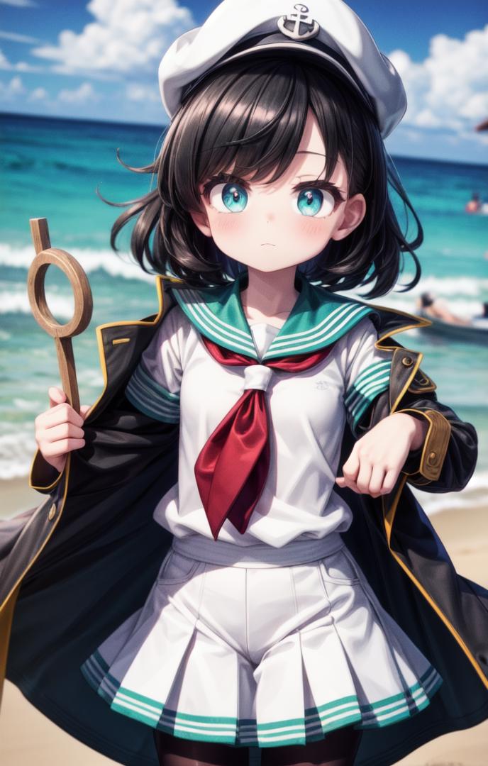 1girl,hat,sailor,gren eyes,short hair,black hair,sailor collar,white shirt,white skirt,