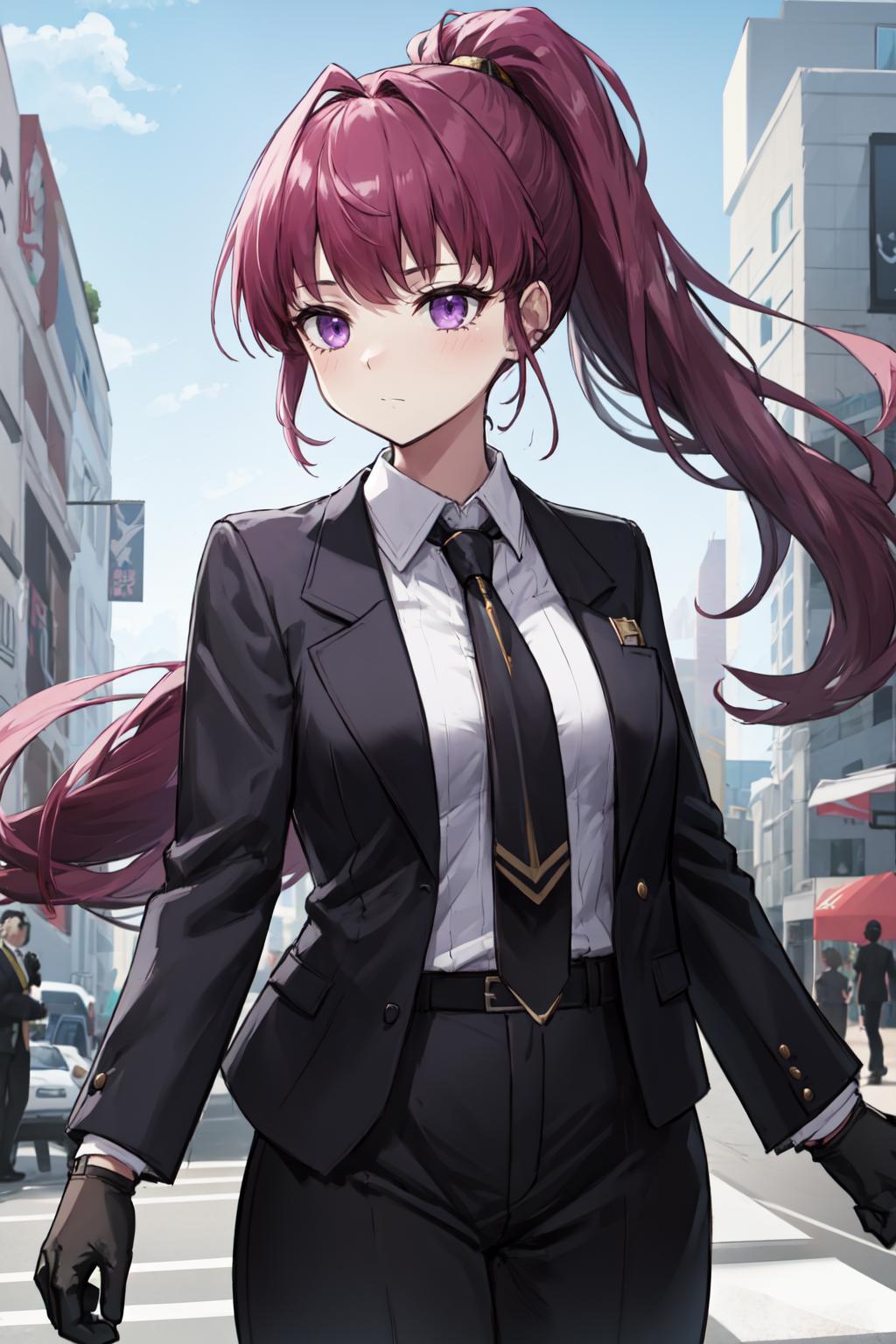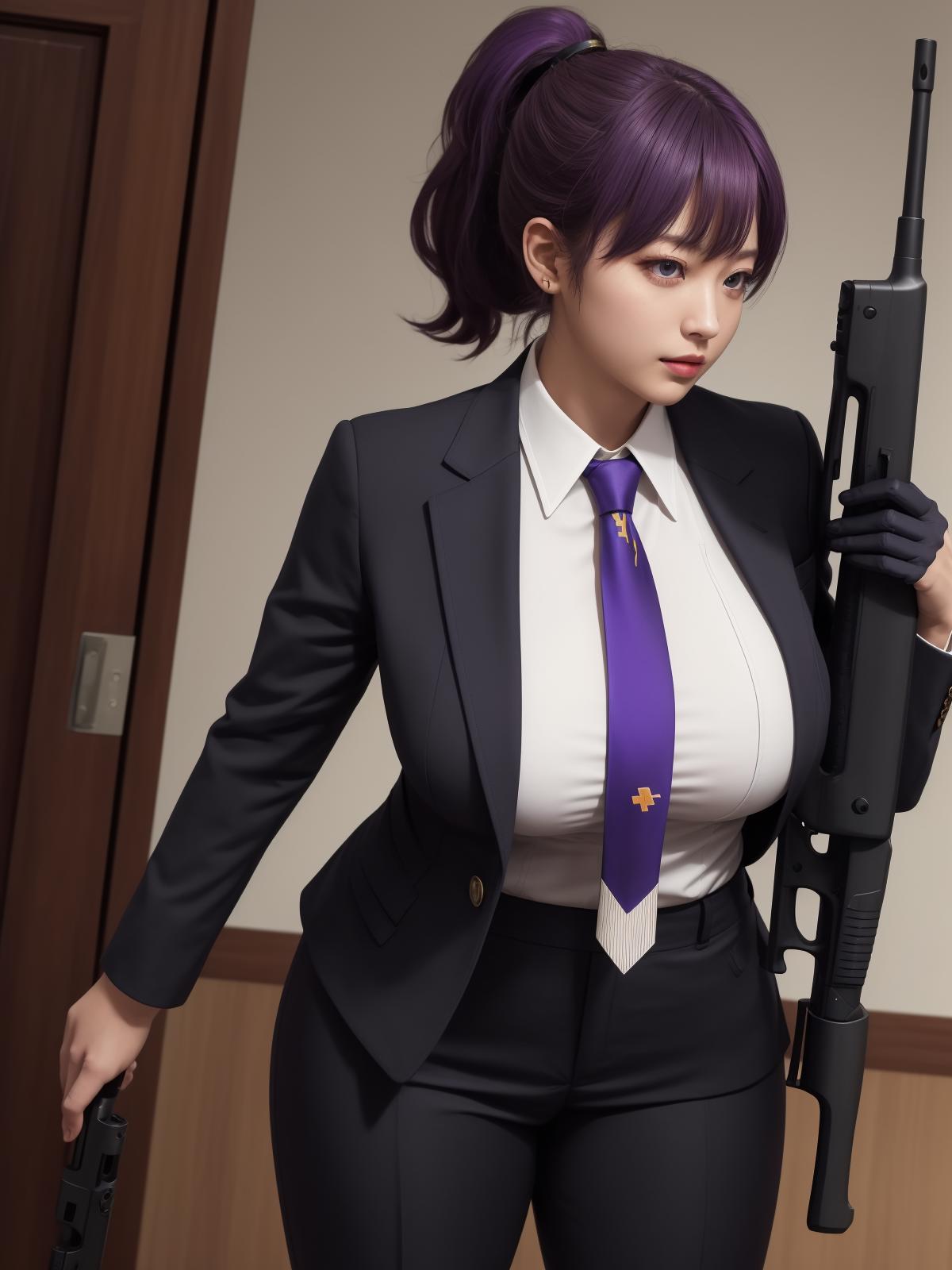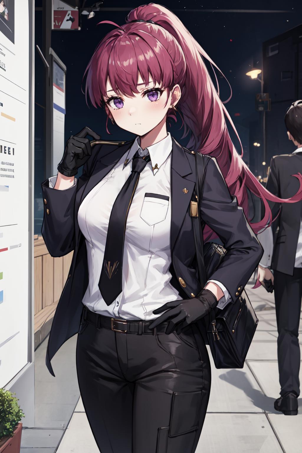 dolla \(nikke\), purple eyes, dolladef, suit, jacket, black gloves, black pants, necktie