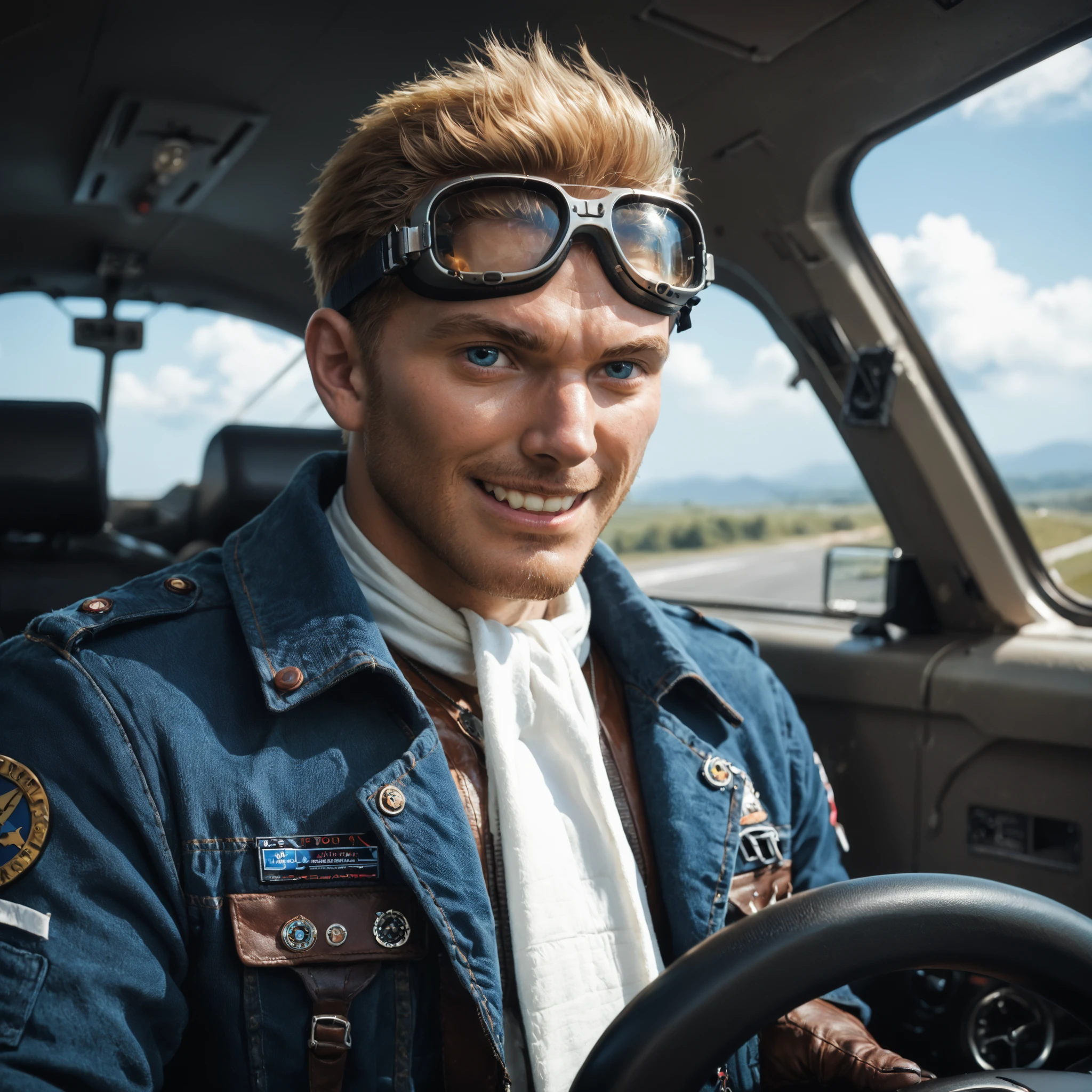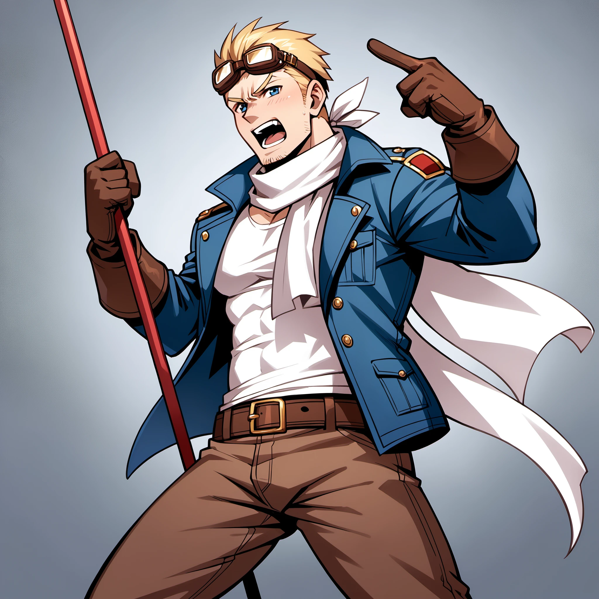 For all varients: cidhighwind, cid highwind, blonde hair, blue eyes, goggles on head, hair slicked back, polearm, holding polearm, perfect face, perfect body, medium hair, muscular male, mature male, stubble