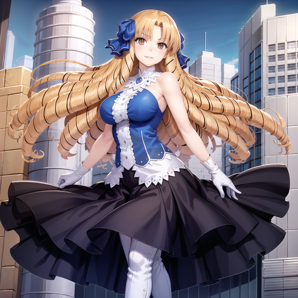 a woman in a blue dress and white boots poses, 1girl, solo, blonde hair, long hair, gloves, indoors, room background, yellow eyes,