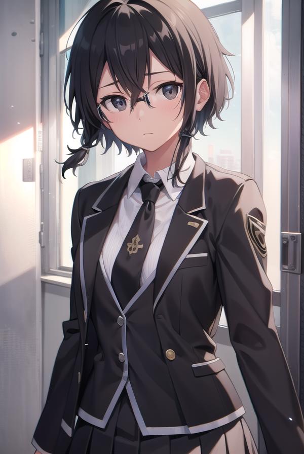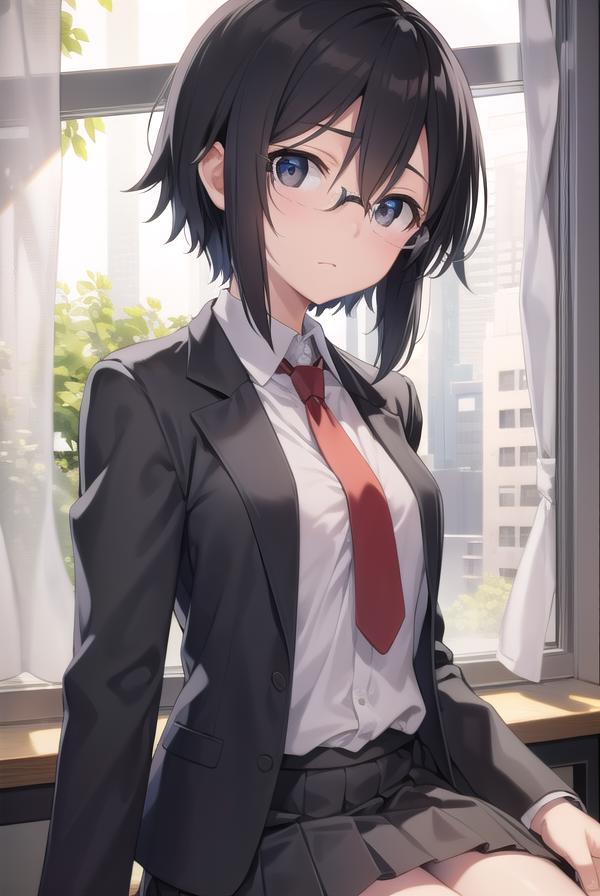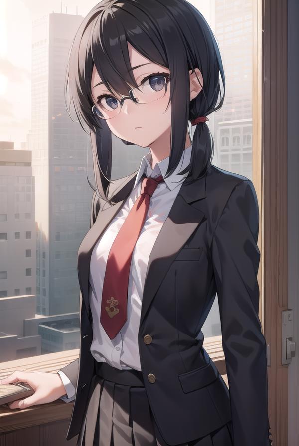 blazer, black jacket, black skirt, jacket, necktie, pleated skirt, red necktie, ribbon, school uniform, skirt, tress ribbon,