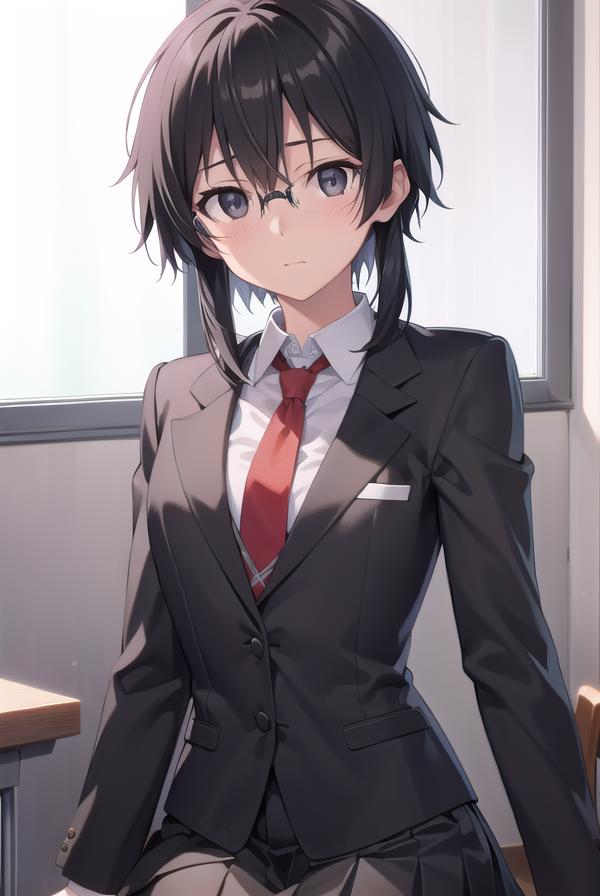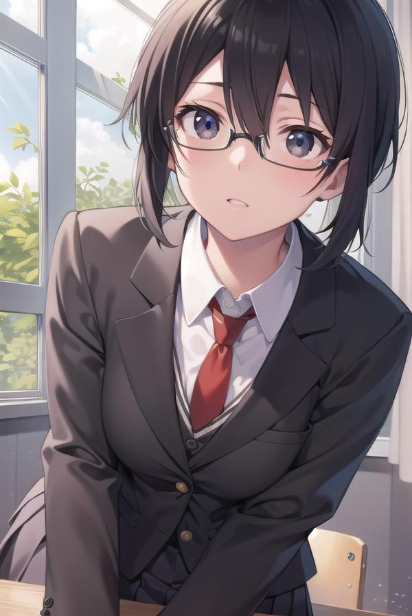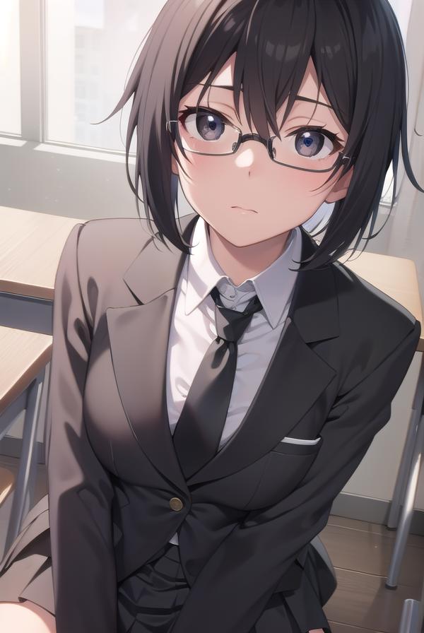 shino asada, (black eyes:1.5), black hair, hair between eyes, hair ribbon, short hair, sidelocks, glasses,