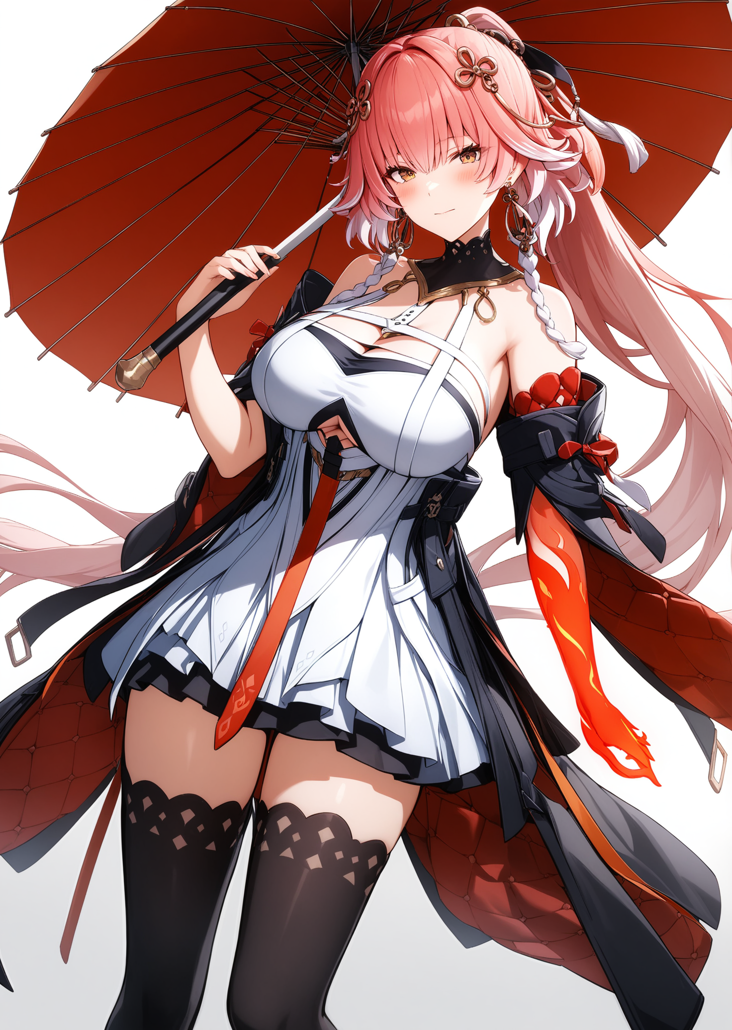 closed mouth, yellow eyes, ponytail, pink hair, multicolored hair, cowboy shot, earrings, white dress, thigh strap, single glove
