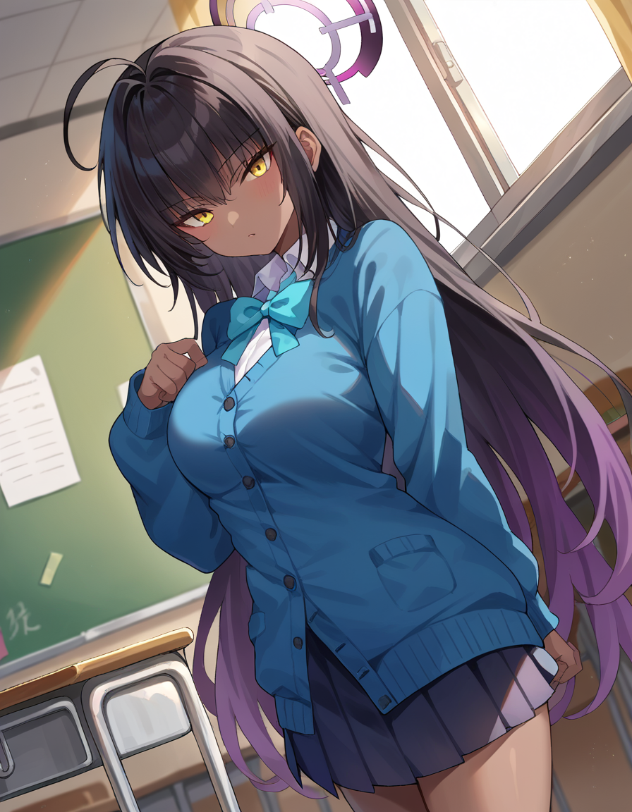 karin, ahoge, black hair, dark skin, dark-skinned female, halo, long hair, yellow eyes,