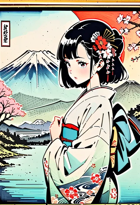 推荐使用大模型:AAM XL (Anime Mix)Animagine XL V3.1AutismMix SDXL(Ukiyo-e style),retro movie, Japanese kimono, cherry blossom trees ,standing,1. Geisha,Hair accessories,Delicate face,gentle expression, Mount Fuji,dark hair,Quiet atmosphere,Natural Environment,traditional media, masterpiece, is the best quality,