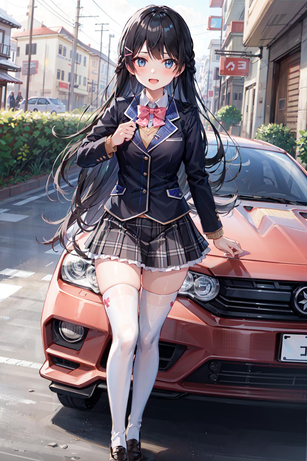 1girl, solo, tsukino mito, long hair, black hair, blazer, black jacket, hairclip, hair ornament, white thighhighs, bangs, braid, pleated skirt, pink bow, school uniform, long sleeves, collared shirt, white shirt, blue eyes, plaid skirt, black skirt