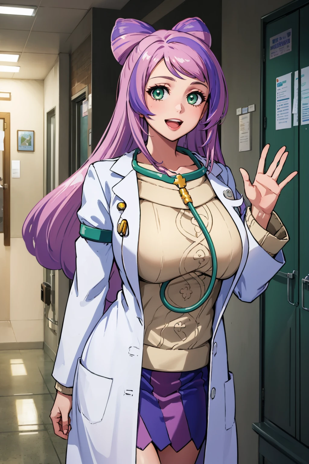 Add "earrings, labcoat, stethoscope, sweater, purple skirt" for her typical look.